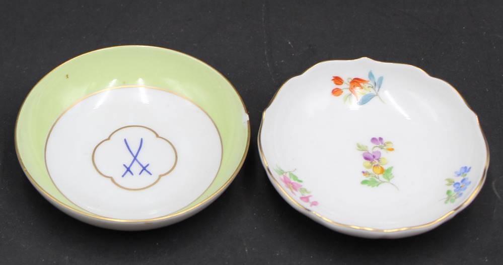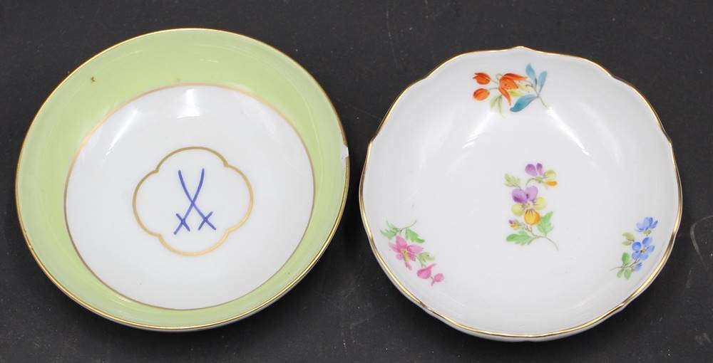 2x kl. Schälchen "Meissen", D-ca. 8 cm, 1x erste, 1x zweite Wahl, 1x Rand mit Chip