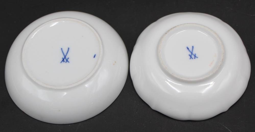 2x kl. Schälchen "Meissen", D-ca. 8 cm, 1x erste, 1x zweite Wahl, 1x Rand mit Chip [1]
