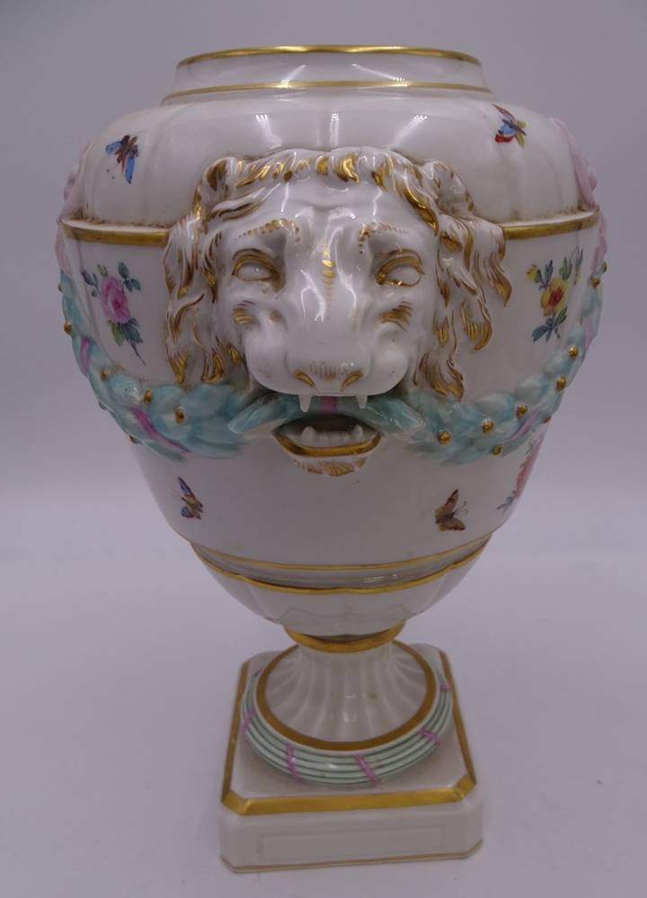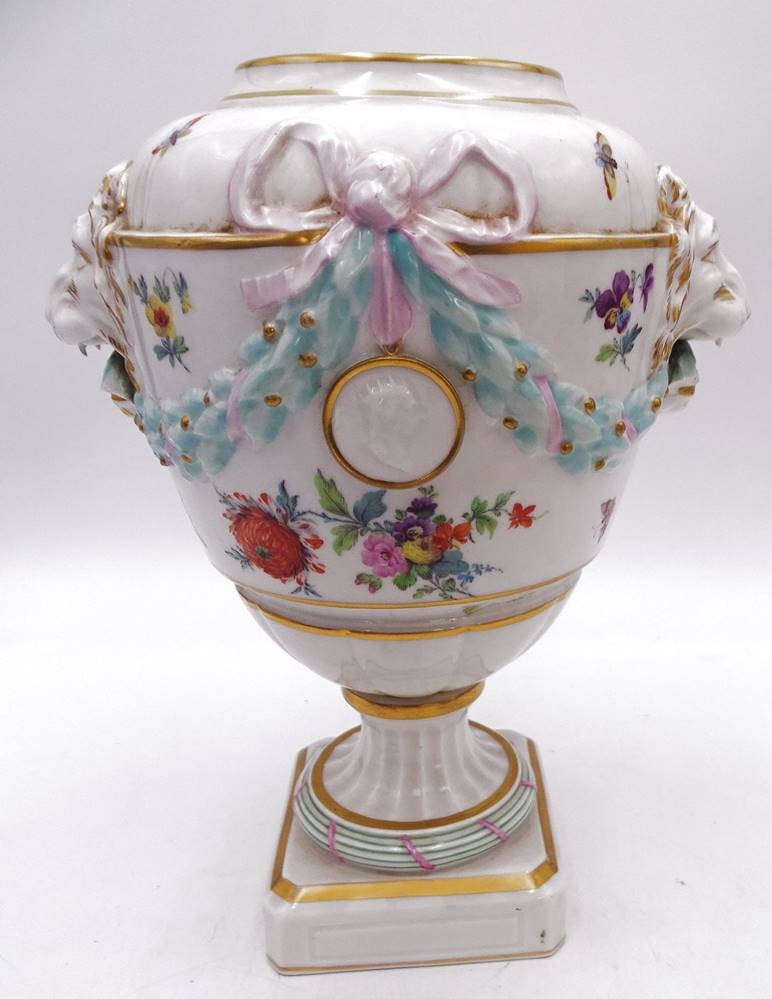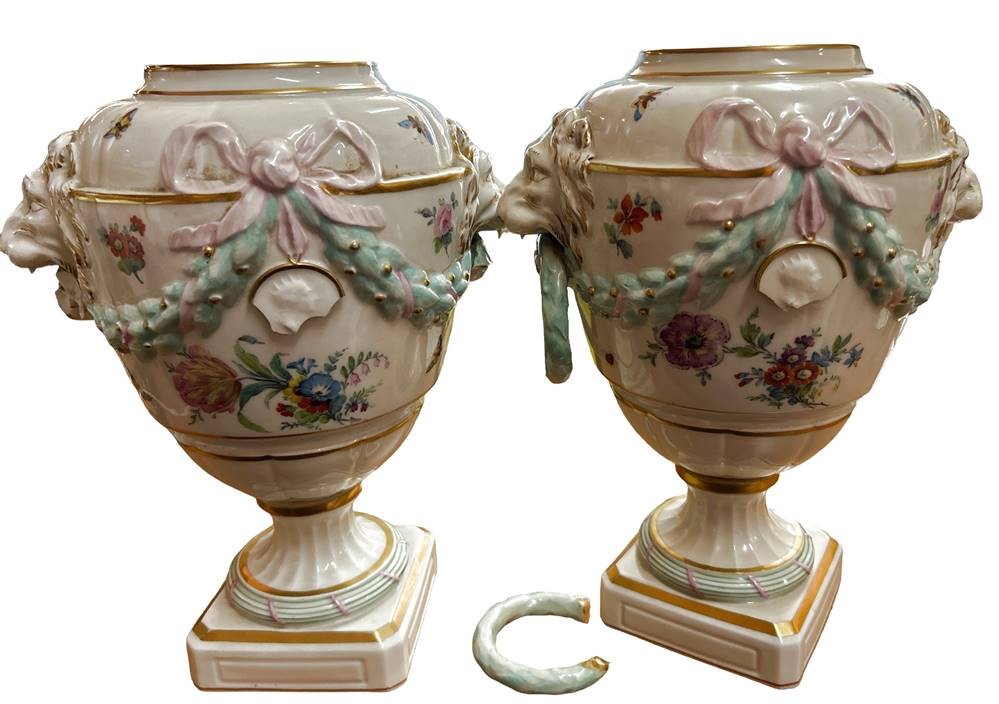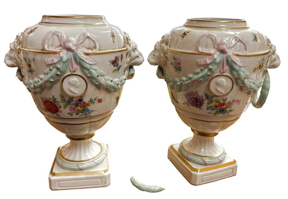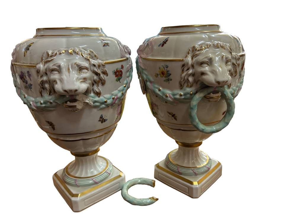 2x KPM Urnenvasen um 1880, bei beiden ein Medaillon beschädigt, H-27 cm, Zeptermarke und Reichsapfel, beidseitig Löwenköpfe mit Girlanden, 3x fehlen die Ringe, aber einmal Bruchstück anbei [1]