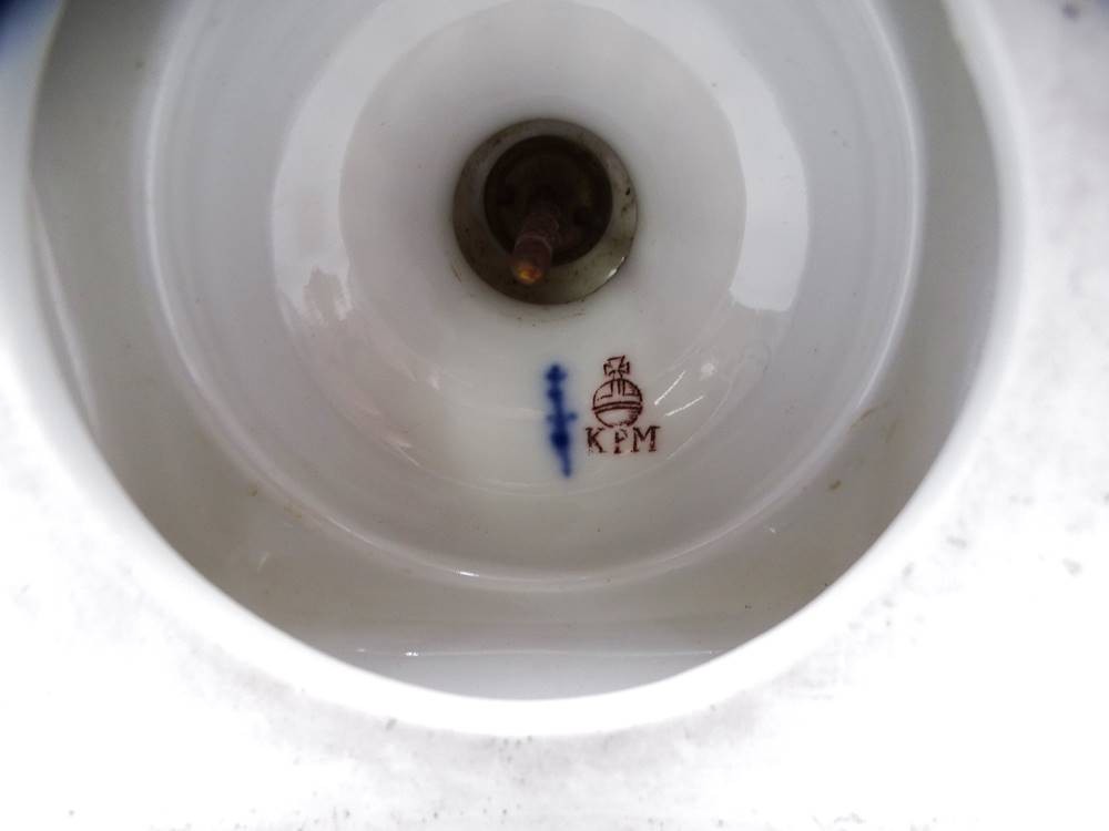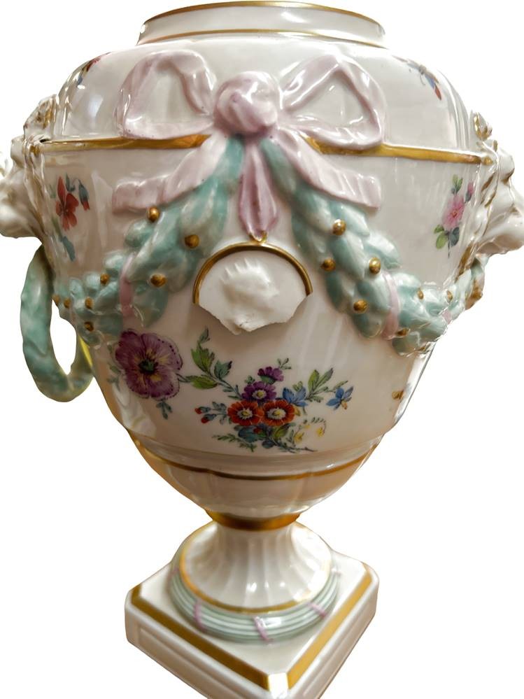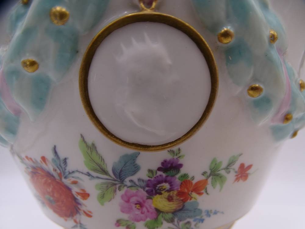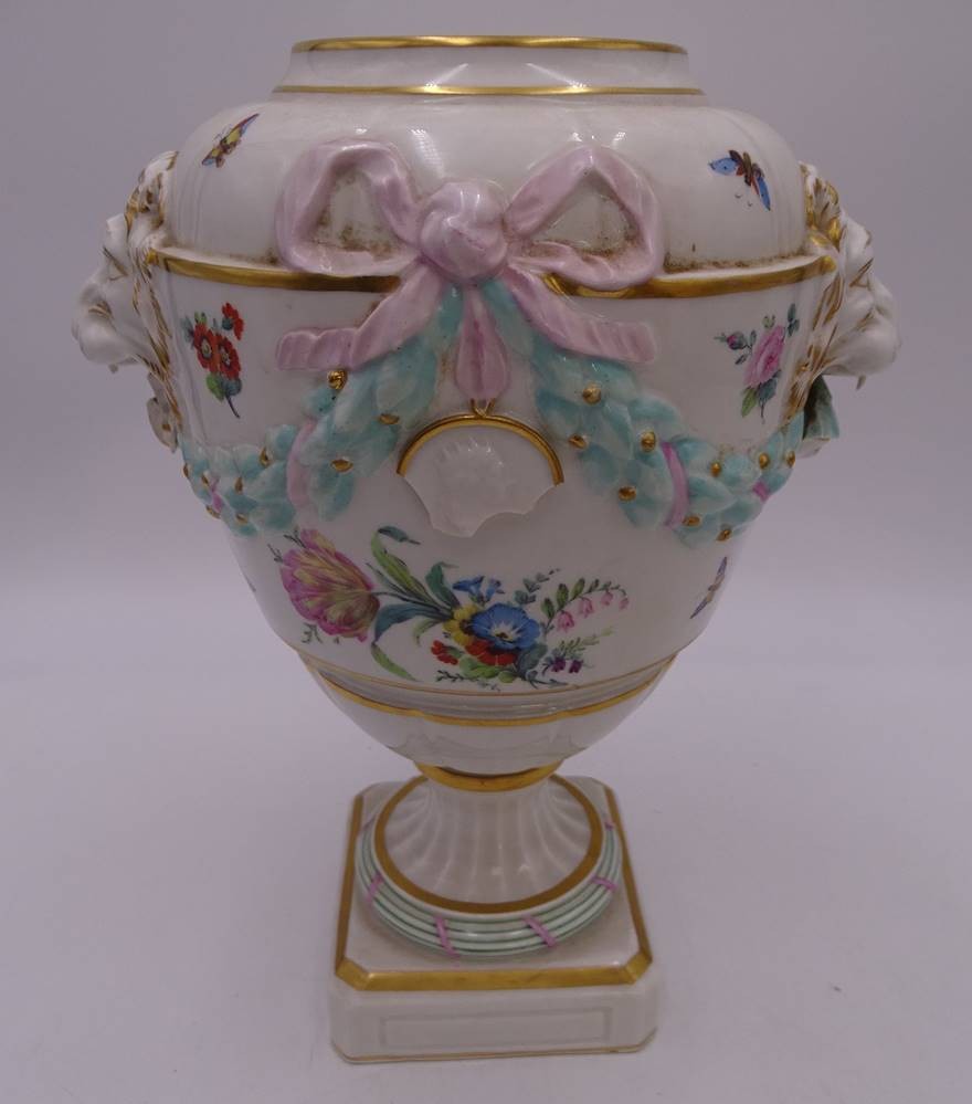 2x KPM Urnenvasen um 1880, bei beiden ein Medaillon beschädigt, H-27 cm, Zeptermarke und Reichsapfel, beidseitig Löwenköpfe mit Girlanden, 3x fehlen die Ringe, aber einmal Bruchstück anbei [1]