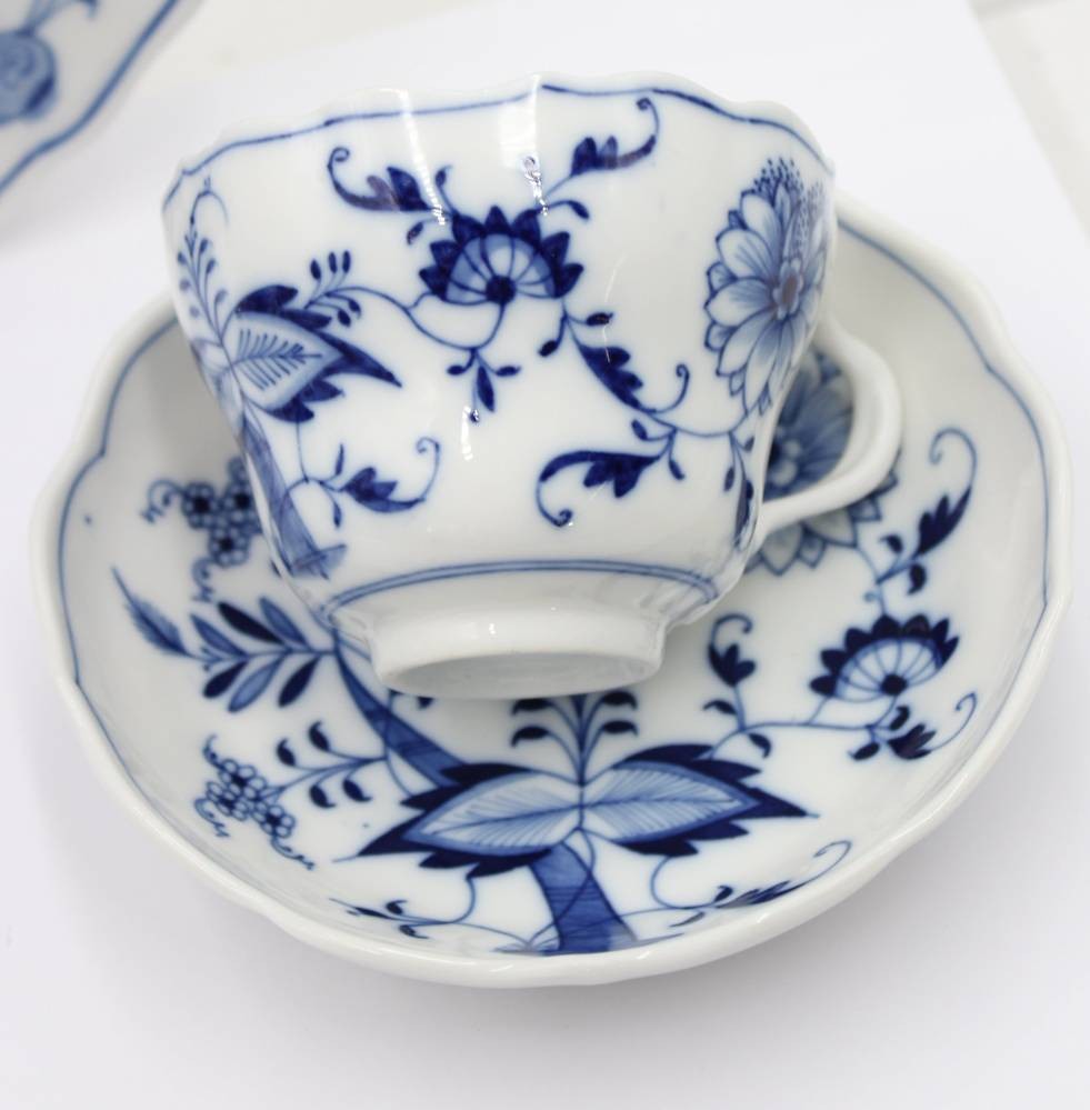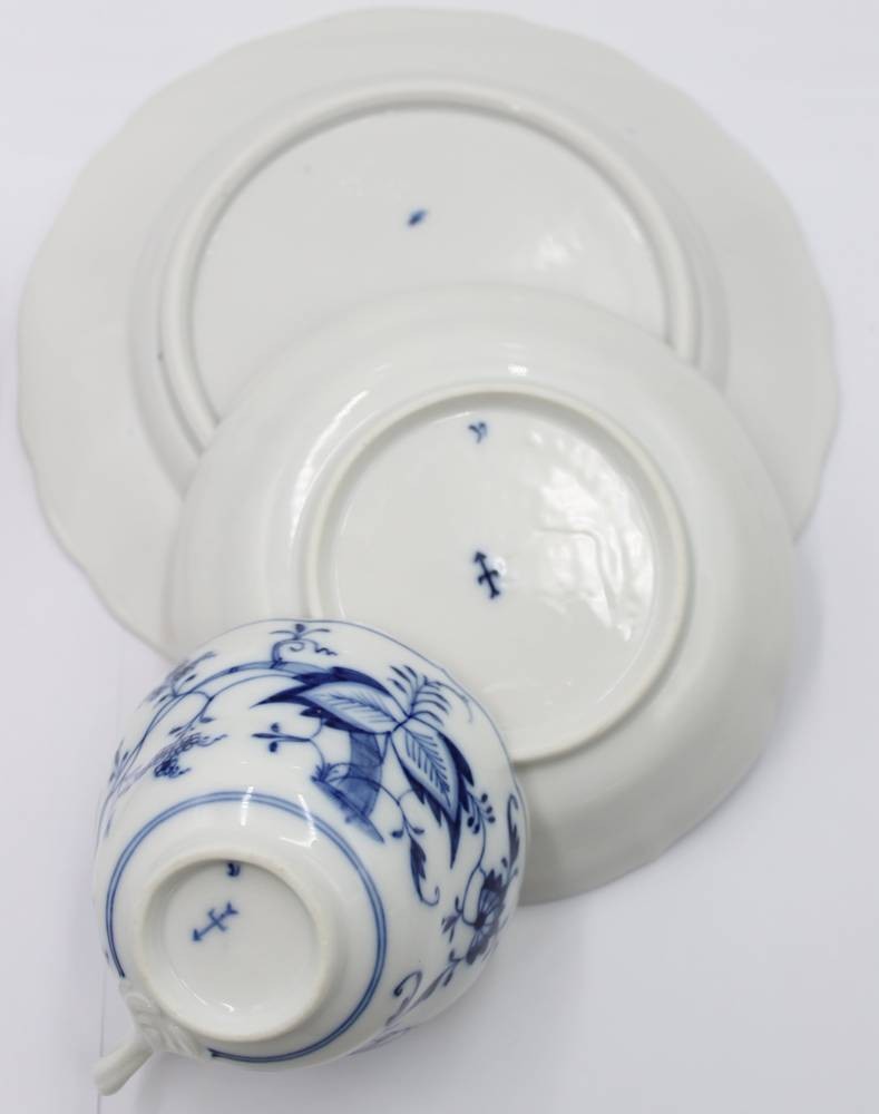 2x Tassen mit U.T. sowie Kuchenteller, Stadt Meissen, Zwiebelmuster, älter, 1x Tasse mit Chip, ca. H-6,6cm [1]