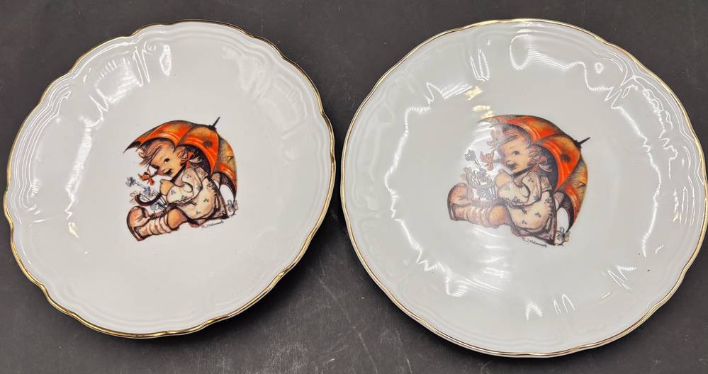 2x Teller und 2 Kakao-Tassen H-12 cm, mit U.T. Streuerpaar, H-6 cm "Reutter" mit Hummel-Motiven
