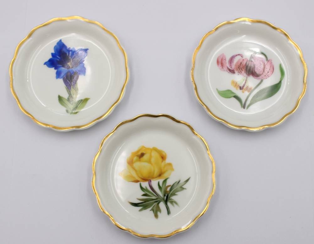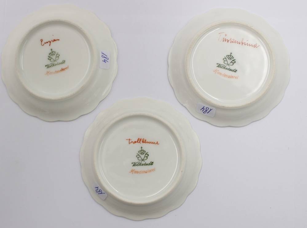 3 kl. Tellerchen von Volkstedt mit Blumendekor und Goldrand