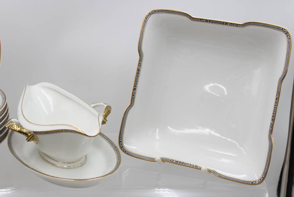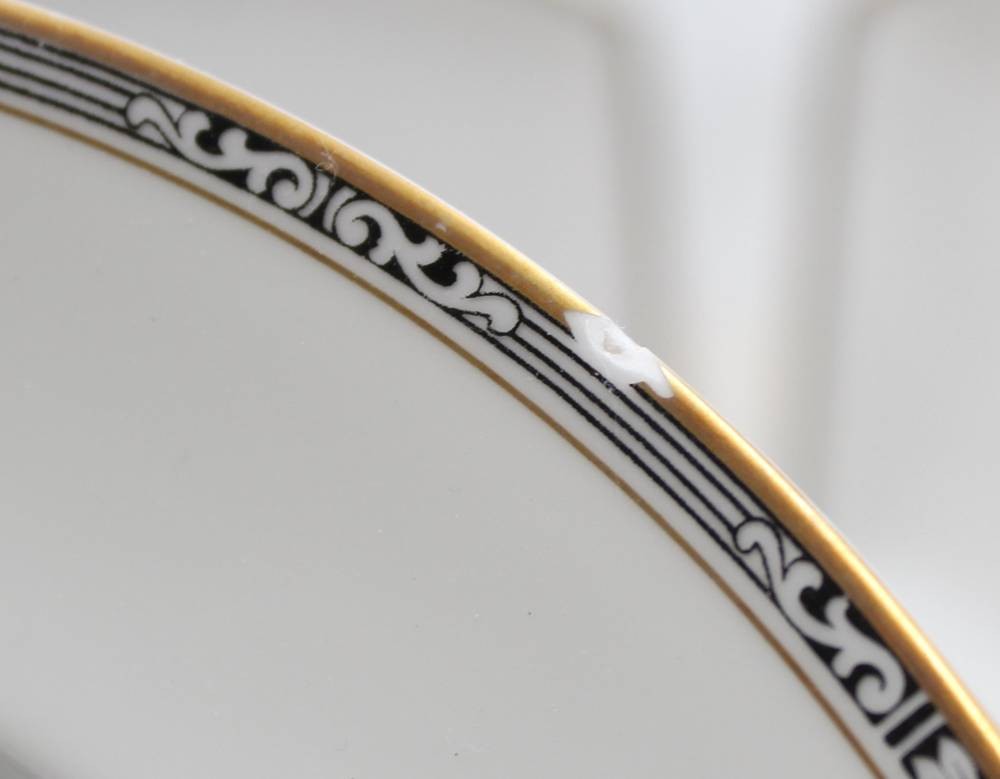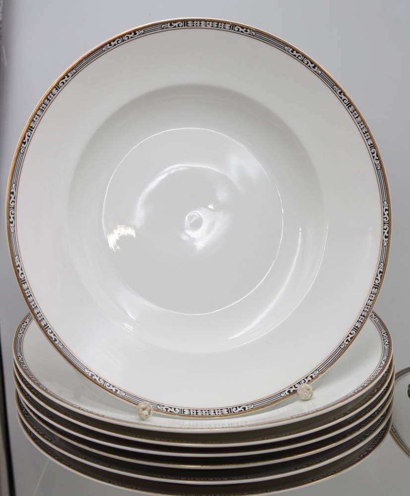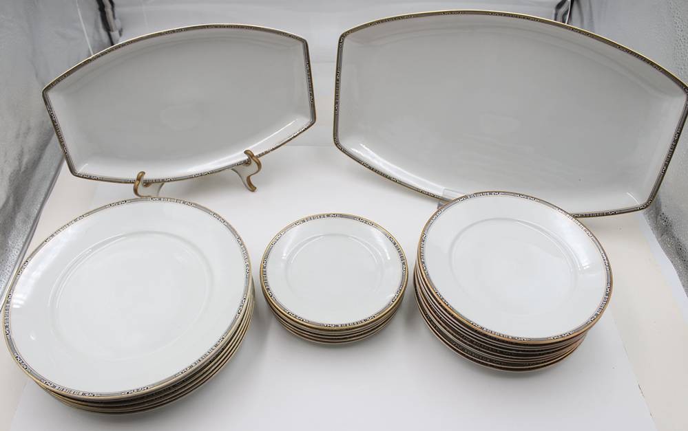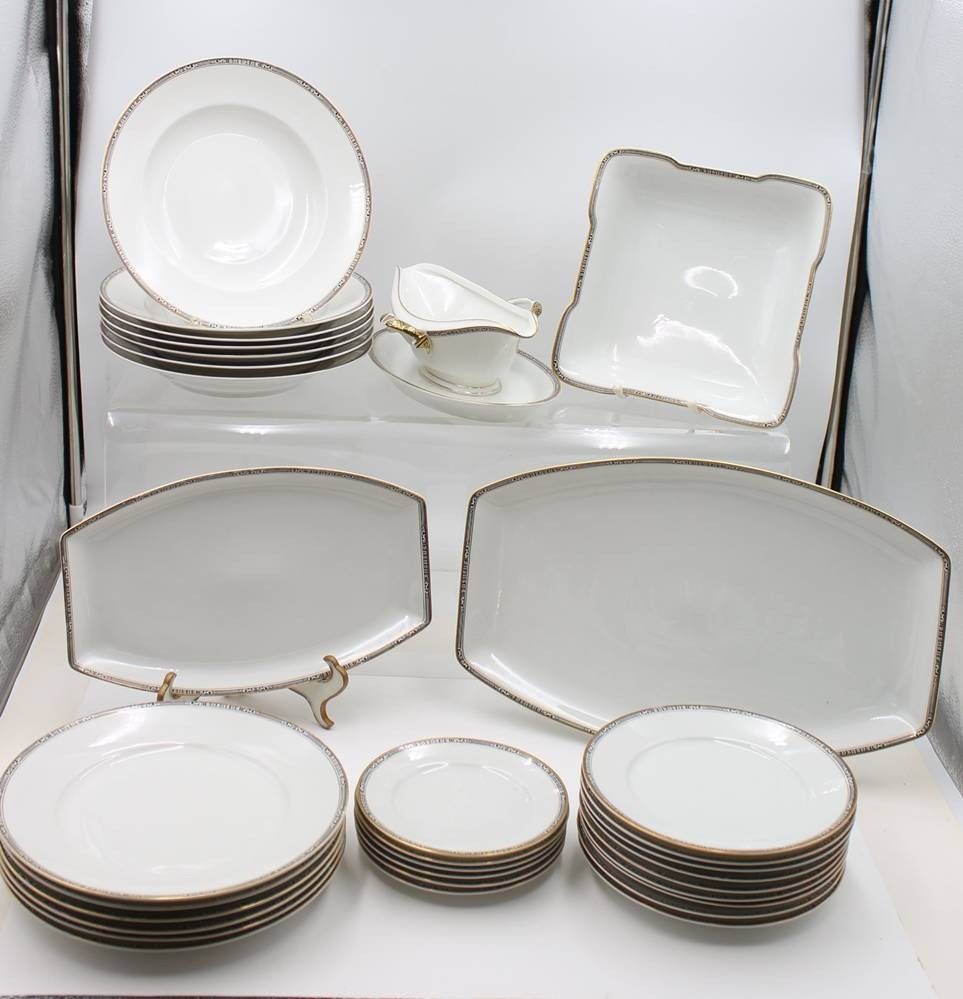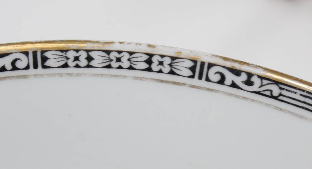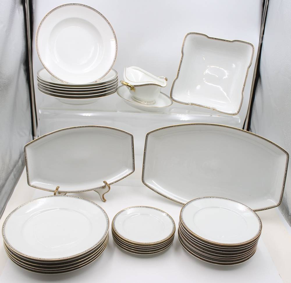 30 Service-Teile, Krautheim, 30er Jahre, Art Déco Goldrand mit schwarzem Ornamentmuster, 1x flacher Teller bestossen, teilw. berieben [1]