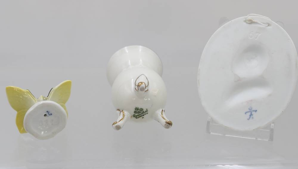 3tlg Konvolut, Schmetterling, Miniaturvase von Rosenthal, Relief-Medaillon Fürstenberg, ca. H-9cm [1]
