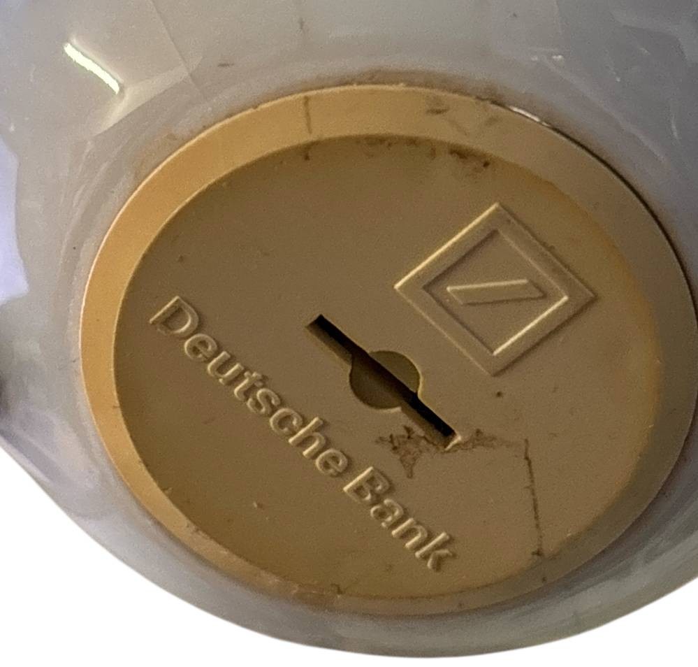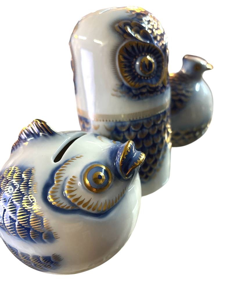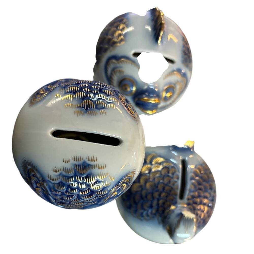3x Spardosen der Deutschen Bank, mit Kobalt und Golddekor, Eule, Fisch, Vogel, H-14 und 9 cm, 1x Hutschreuther gemarkt [1]