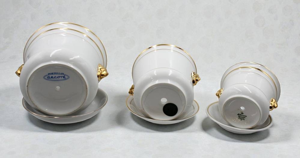 3x Übertöpfe, Löwenköpfe, untersch. Manufakturen, mit Unterteller, ca. H-8,7 bis 12,5cm, D-12 bis 16cm [1]