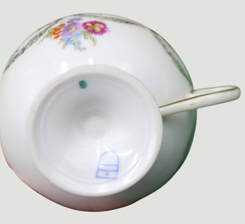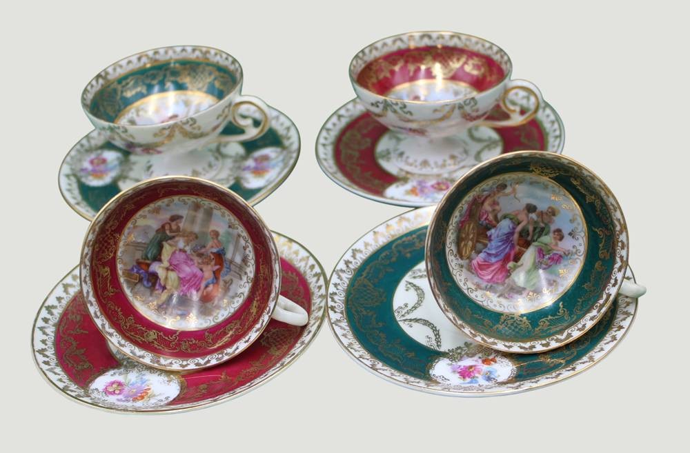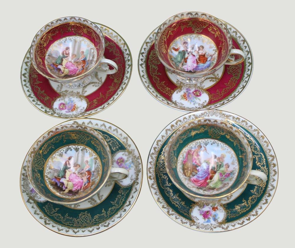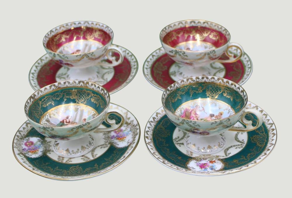 4 Mokkatassen mit U.T., Kaufmann-Szenen, Bienenkorbmarke, wohl Aelteste Volkstedt