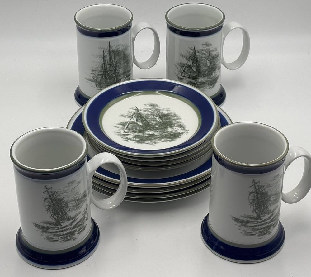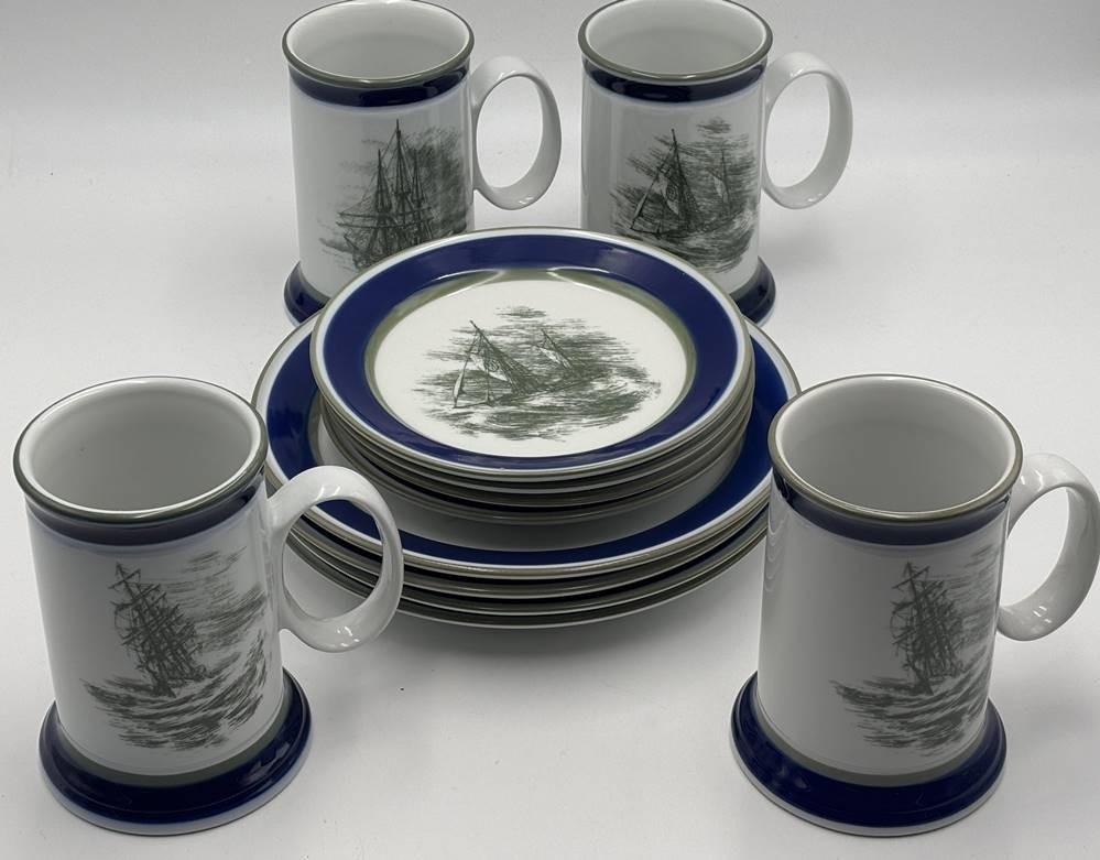 4x komplette Gedecke mit Krügen, norwegische Schiffe, von Christian Rabisch, Manufaktur Porsgrunds Porselænsfabrik