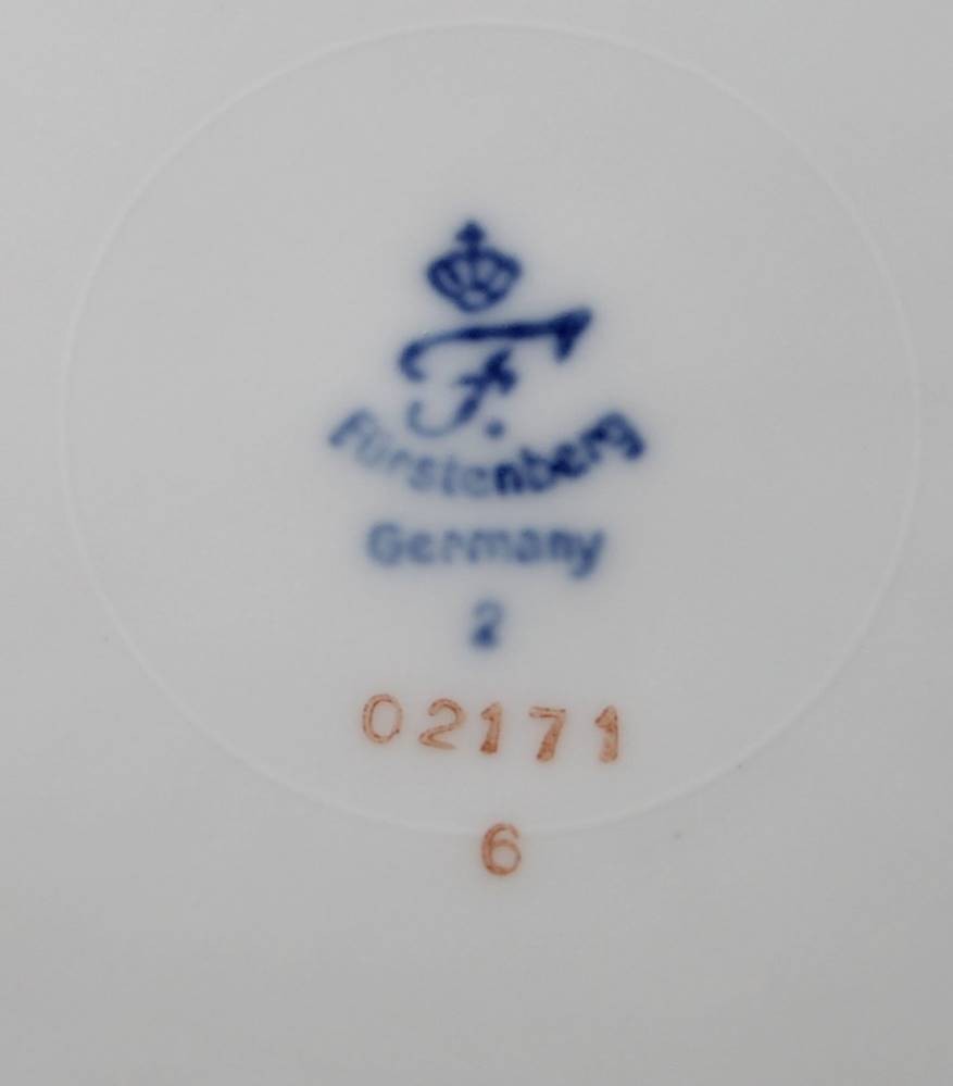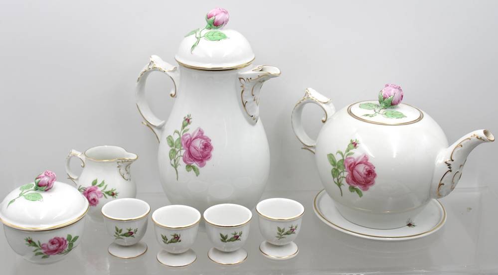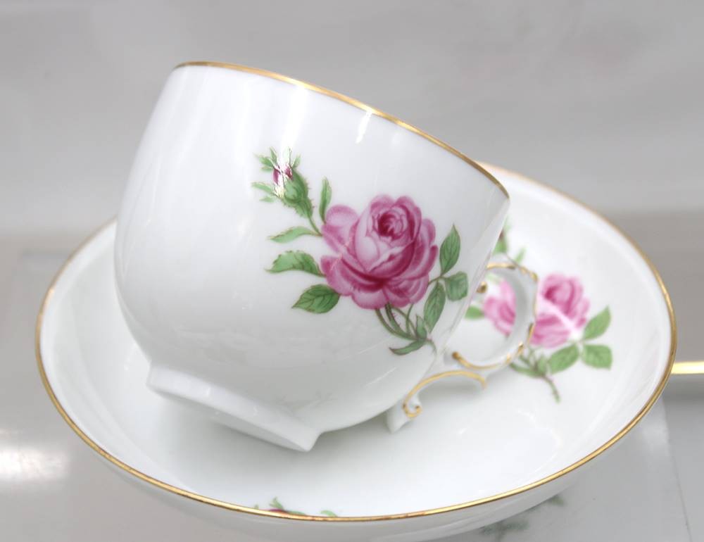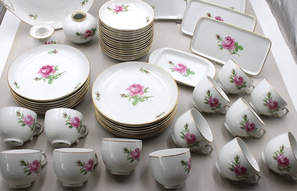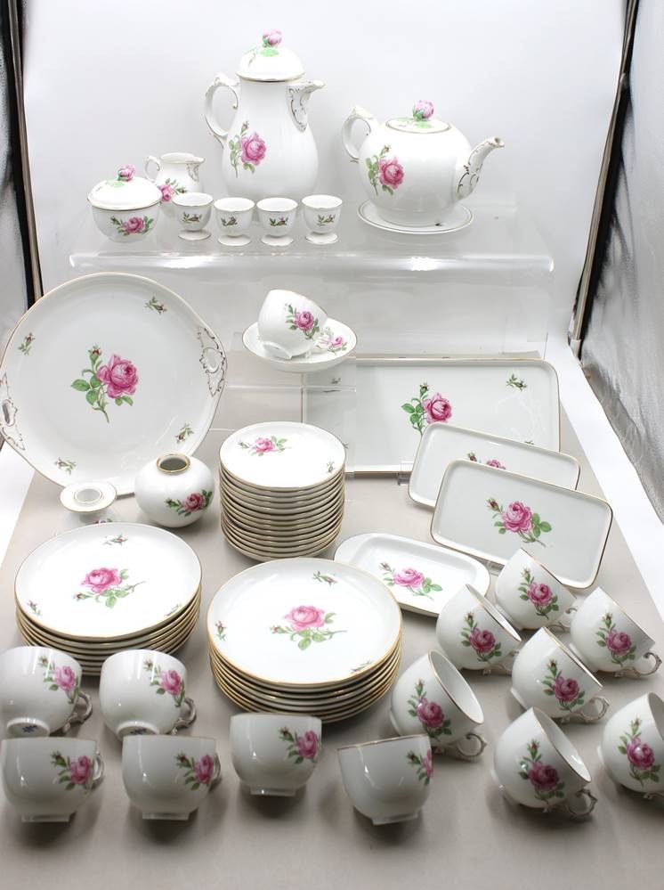 59 Serviceteile, Fürstenberg, Form „Alt Fürstenberg“, Dekor „Rote Rose", Teekanne mit U.T., Kaffeekern, Leuchter und kl. Vase, 4 Eierbecher, 4x div. Platten, 15x Kuchenteller, 14x Tassen mit U.T., Tassen H-5,3cm [1]