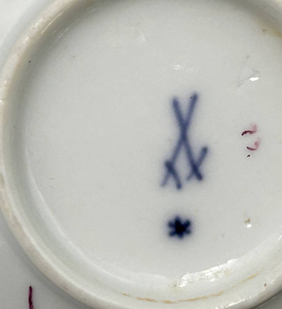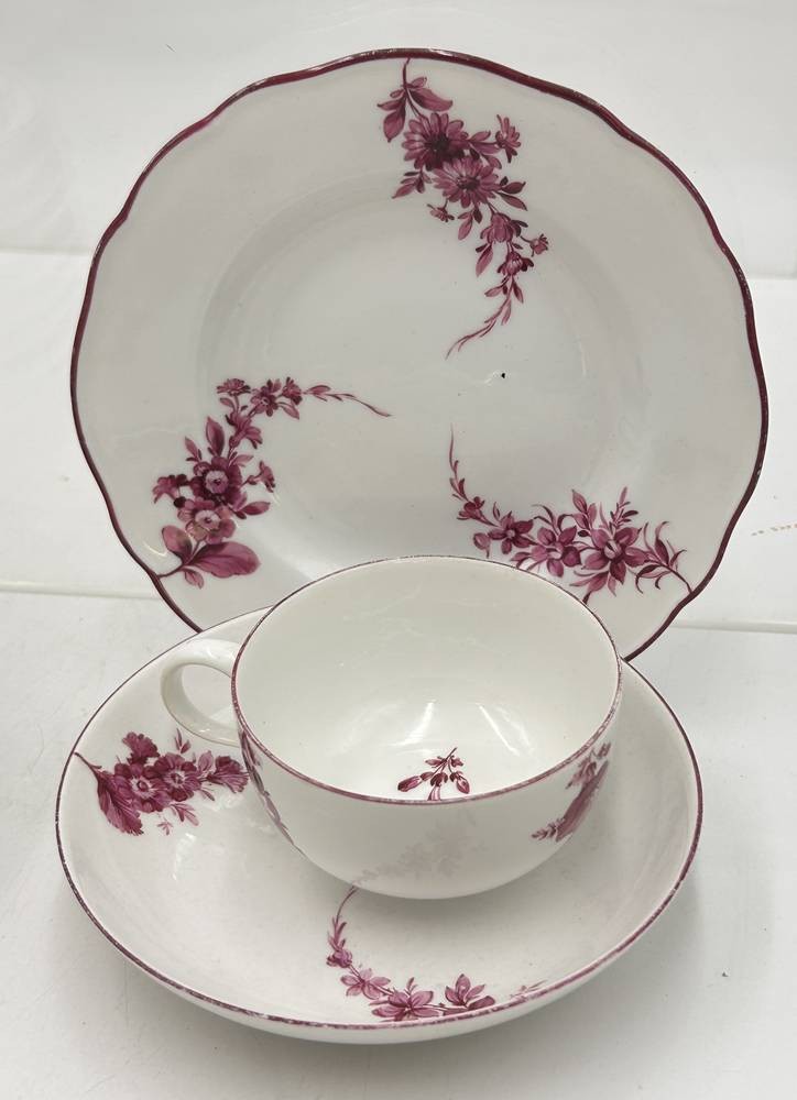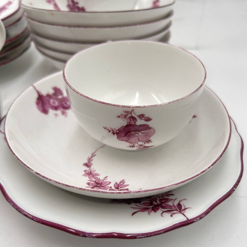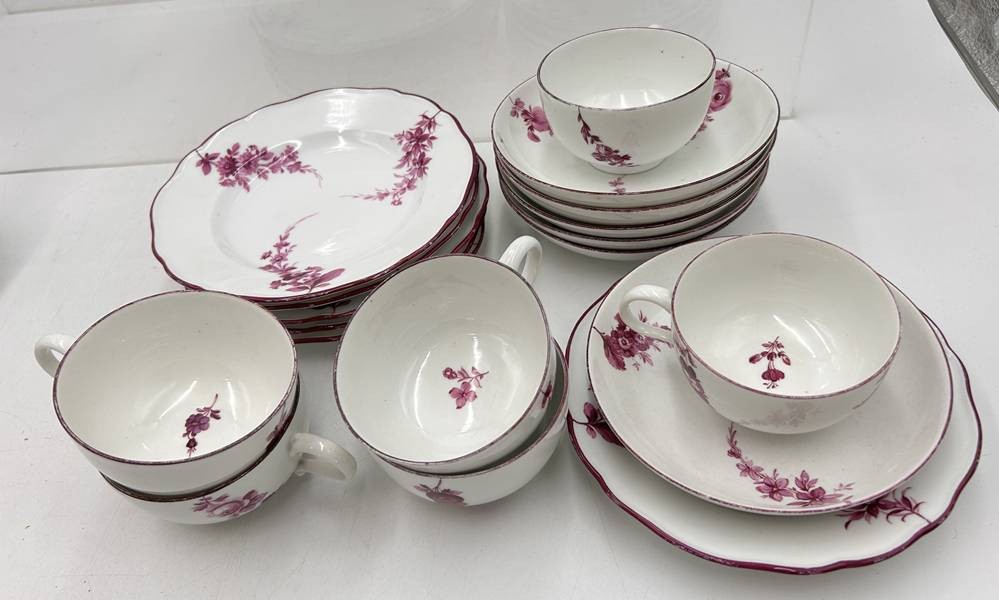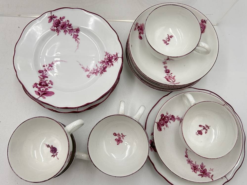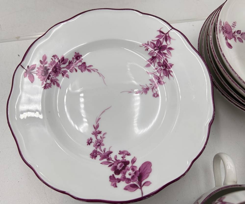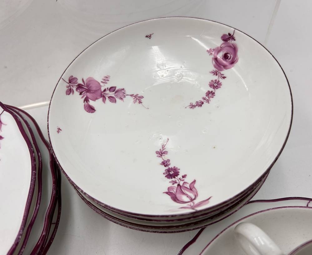 6 Gedecke "Meissen" Purpur floral, Marcollni Zeit um 1780, einige Teile später, überwiegend 1.Wahl, gut erhalten, 18 Teile [1]