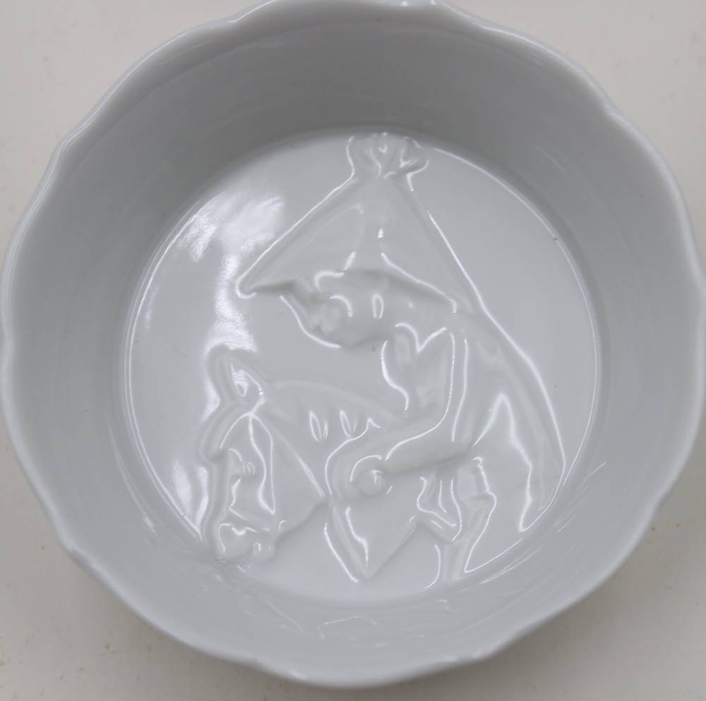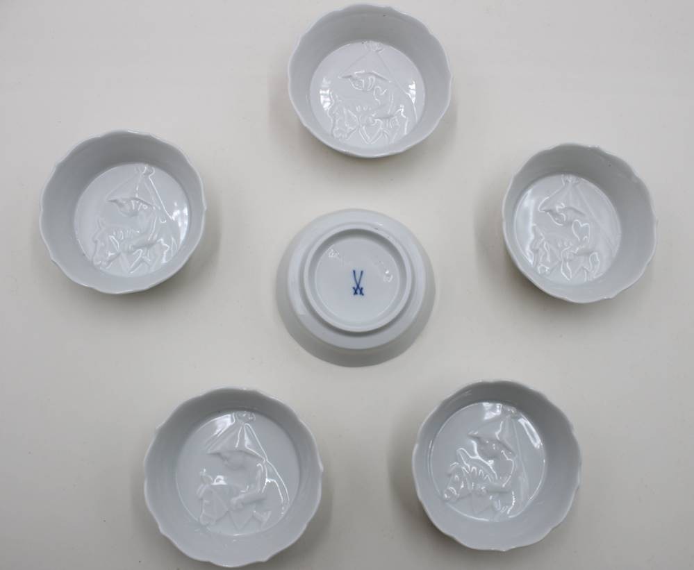 6x Meissen Schälchen, weiß, Neuer Ausschnitt mit Relief "Steckenpferdreiter zu Osnabrück", je 1. Wahl, ca. H-3cm D-8cm [1]