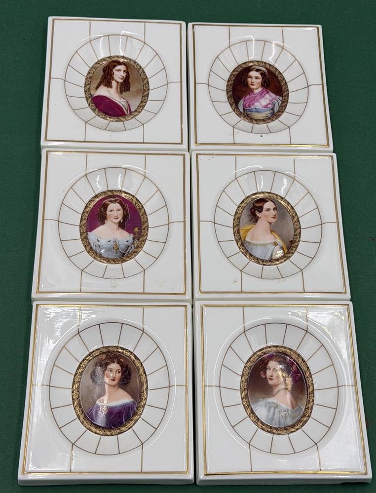 6x Portrait Miniaturen, Kunstdrucke auf "Heinrich" Porzellan, 11x10 cm, 1x Abplatzer am unteren Rand-Galerie der Schönen, verso betitelt