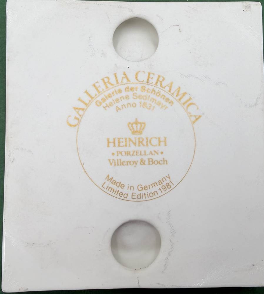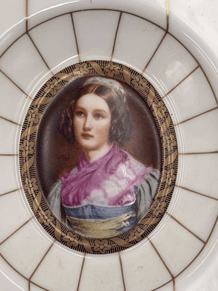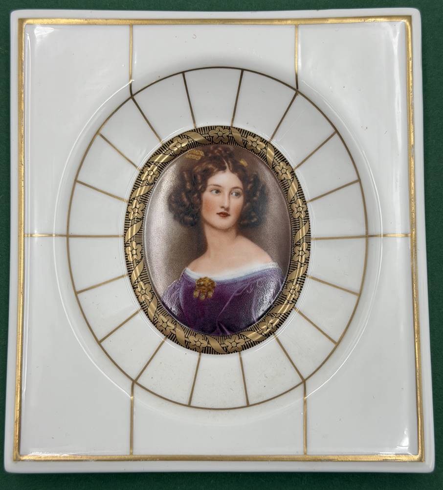 6x Portrait Miniaturen, Kunstdrucke auf "Heinrich" Porzellan, 11x10 cm, 1x Abplatzer am unteren Rand-Galerie der Schönen, verso betitelt [1]