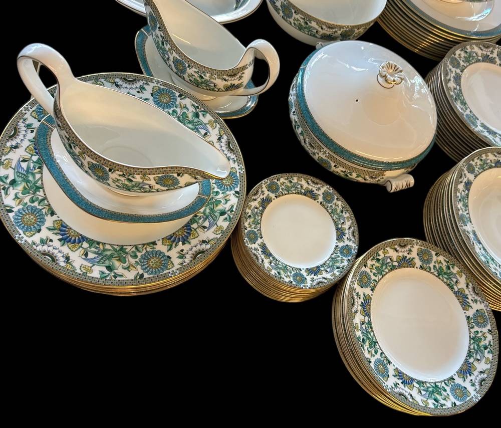 87 tg. Speise-Service "Wedgwood" Babylon, England, 2 Terrinen, 2 Gemüseschalen, 2 ovale Schalen, 2 Saucieren mit Unterteller, 11 flache Teller mit Blüten, 12 tiefe Teller, 12 Obstteller, 12 Desertteller, 12 Beilagenteller, 12 flache Teller mit grünen Rand, D-24 cm,
