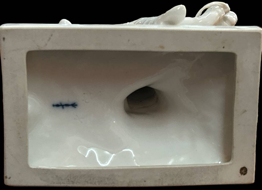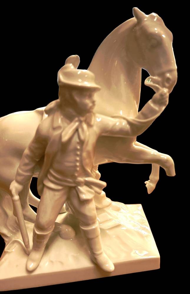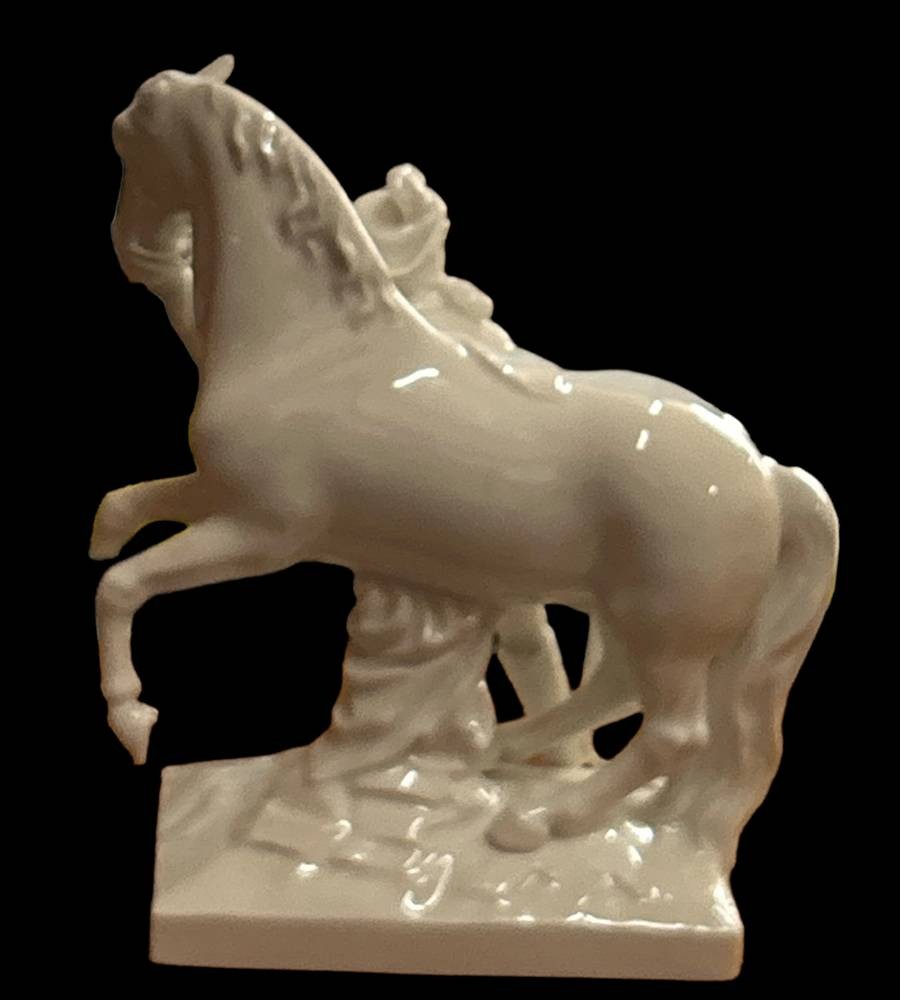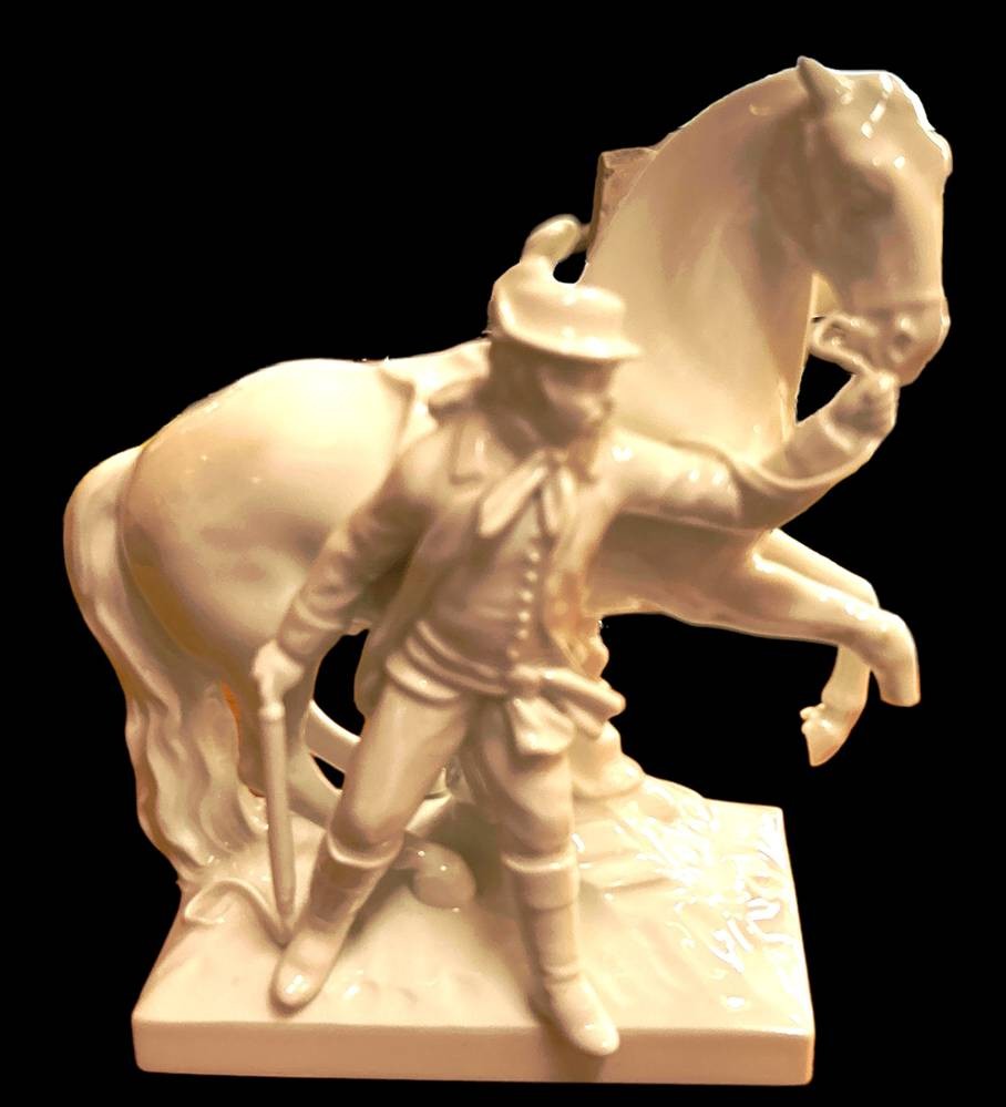 aufsteigendes Pferd mit Pferdeknechtr "KPM" Berlin, weiss, Vorderlauf abgebrochen und halbes Ohr fehlt, H-19 cm, L-17 cm [1]