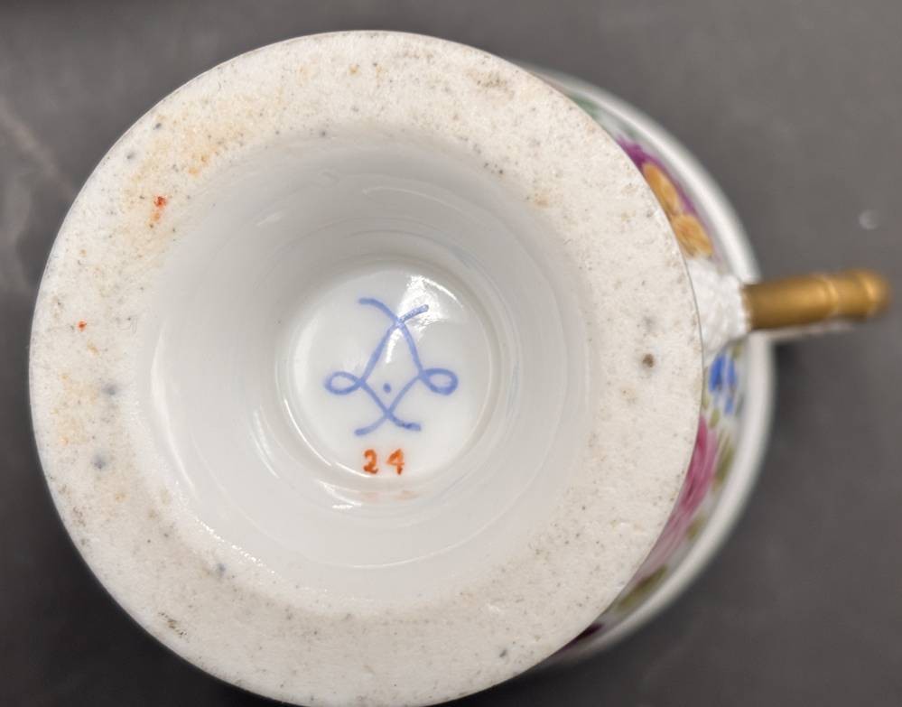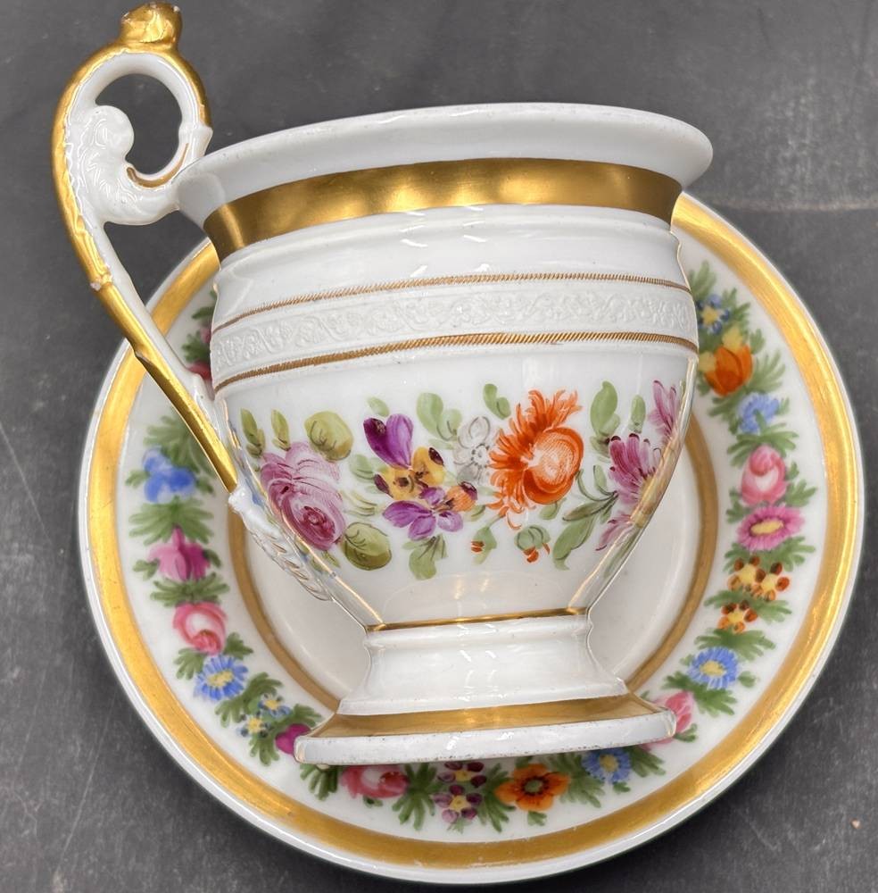 Biedermeier-Tasse mit U.T., Blumendekor und Gold "Sevres"?, H-11 cm