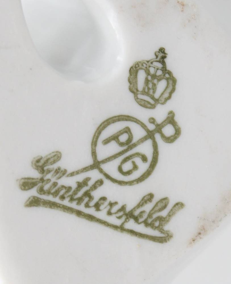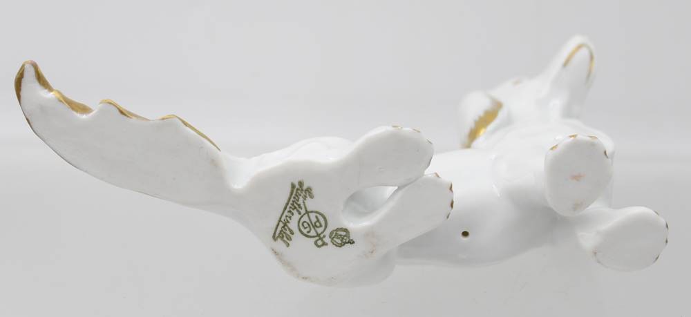 Dackelfigur, Günthersfeld, Goldstaffage, wohl Art-Déco, H-9cm L-16cm