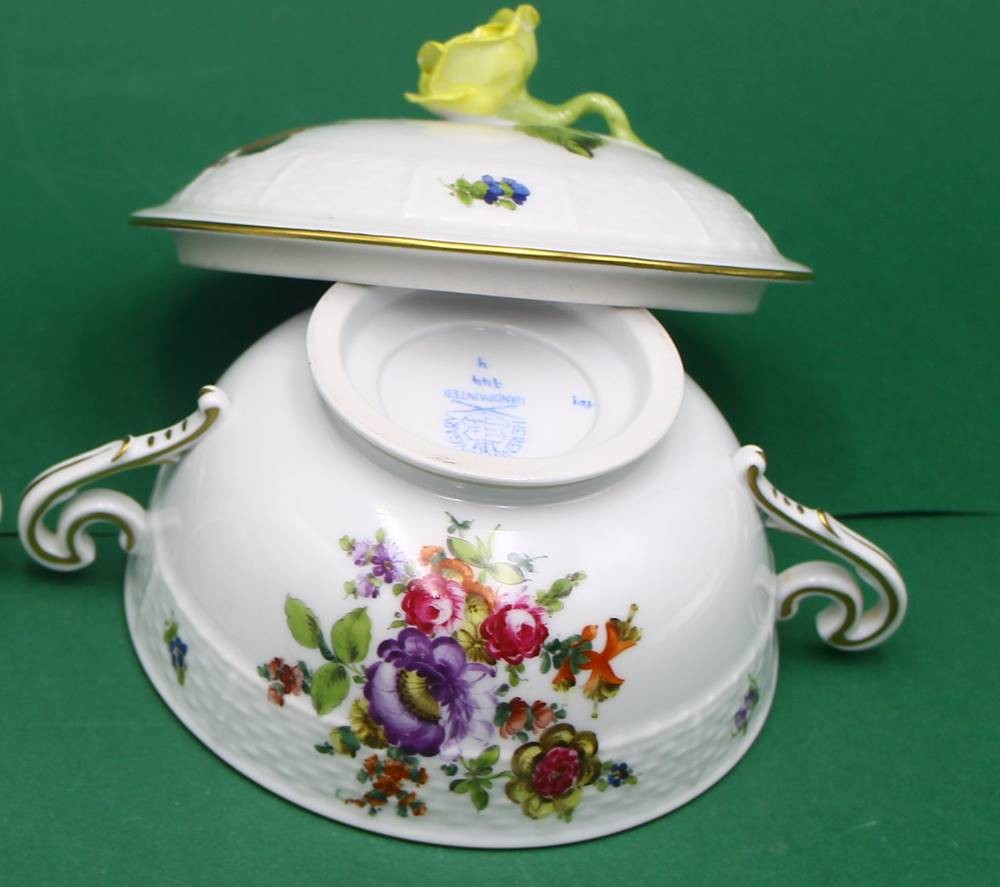 Deckeldose "Herend" Blumen, gelbe Deckelrose, minimalst bestossen, H-ca. 10 cm, B-mit Henkel ca. 14 cm