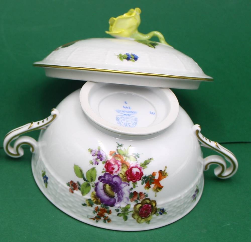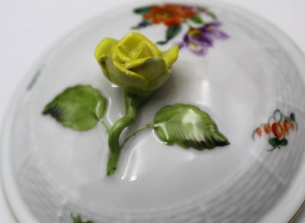 Deckeldose "Herend" Blumen, gelbe Deckelrose, minimalst bestossen, H-ca. 10 cm, B-mit Henkel ca. 14 cm [1]