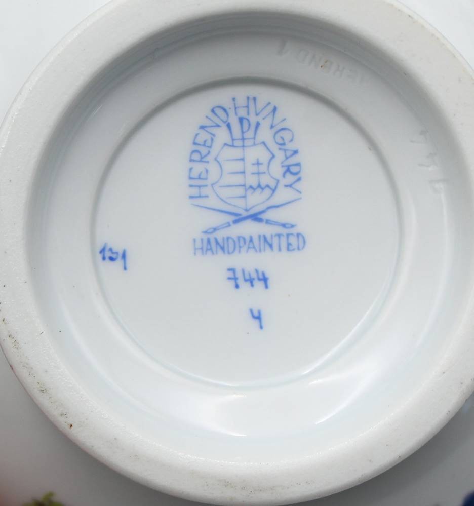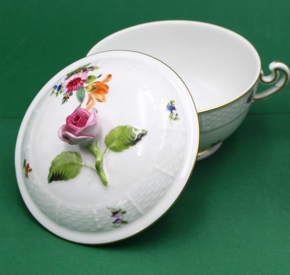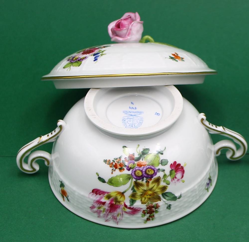 Deckeldose "Herend" Blumen, rote Deckelrose, Hca. 10 cm, B-mit Henkel ca. 14 cm
