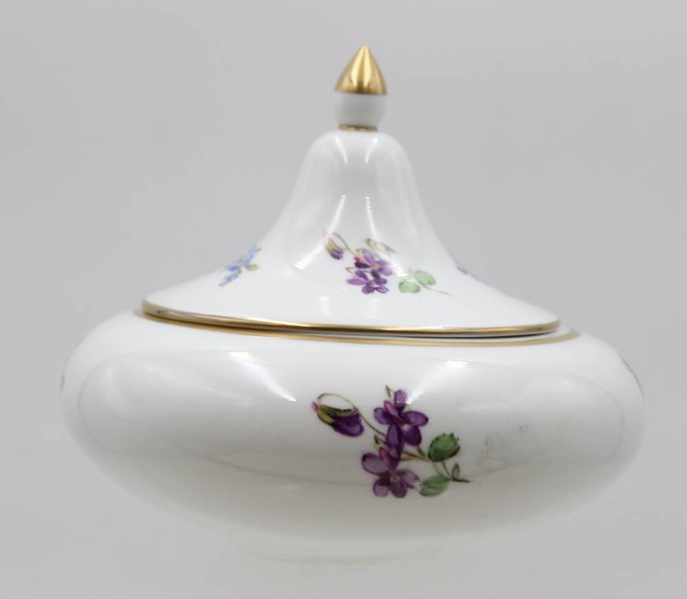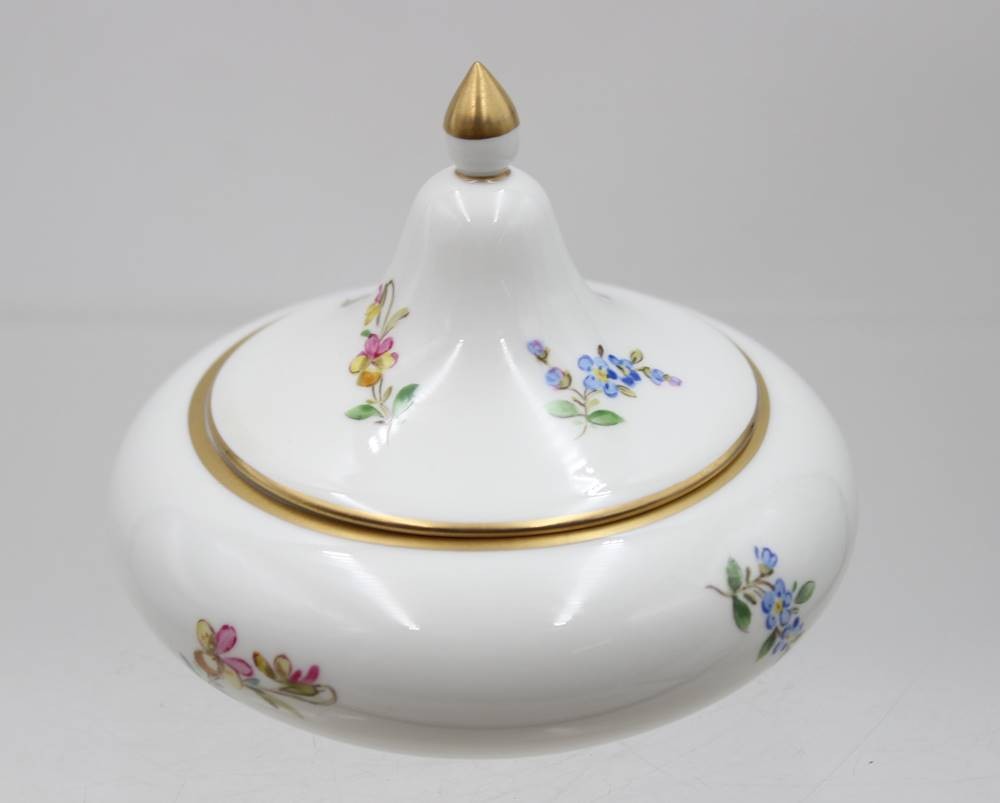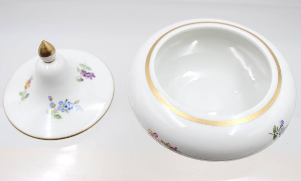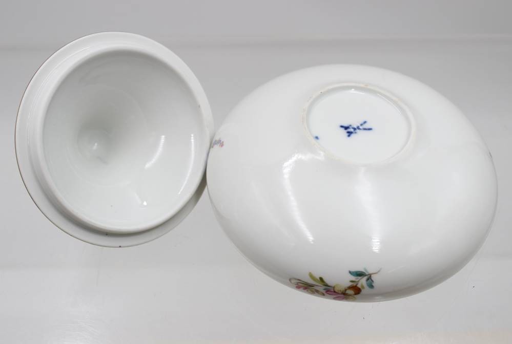 Deckeldose, Meissen, Schwertermarke, Blumenbemalung, 4 Schleifstriche, ca. H-10cm D-12cm [1]