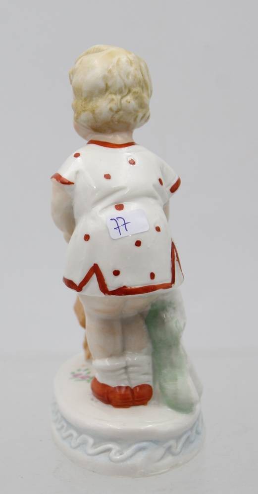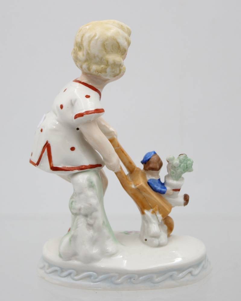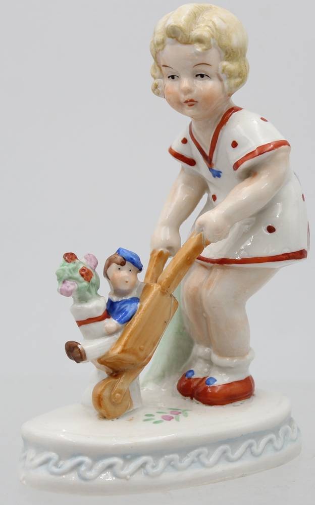 Eine Mädchenfigur die einen Matrosen in einer Karre schiebt . [1]