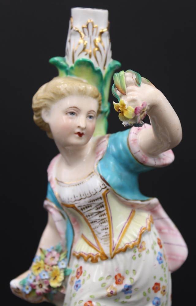 figürlicher Leuchter, Dame mit Blumen, ungedeutete Blaumarke, div. kl. Chips, ca. H-26,5cm [1]