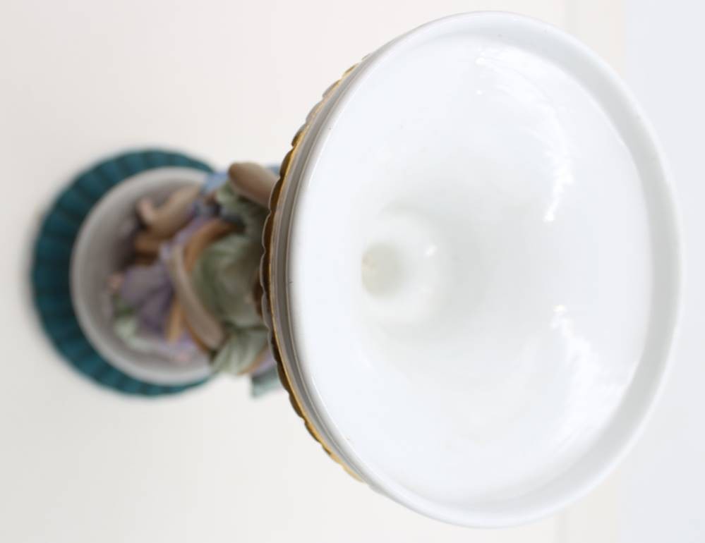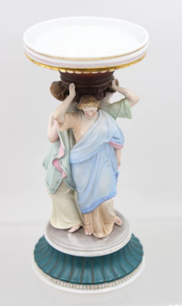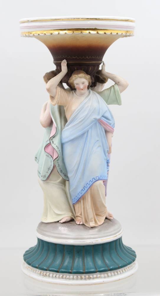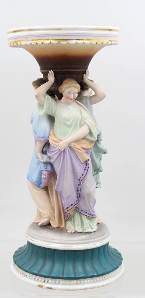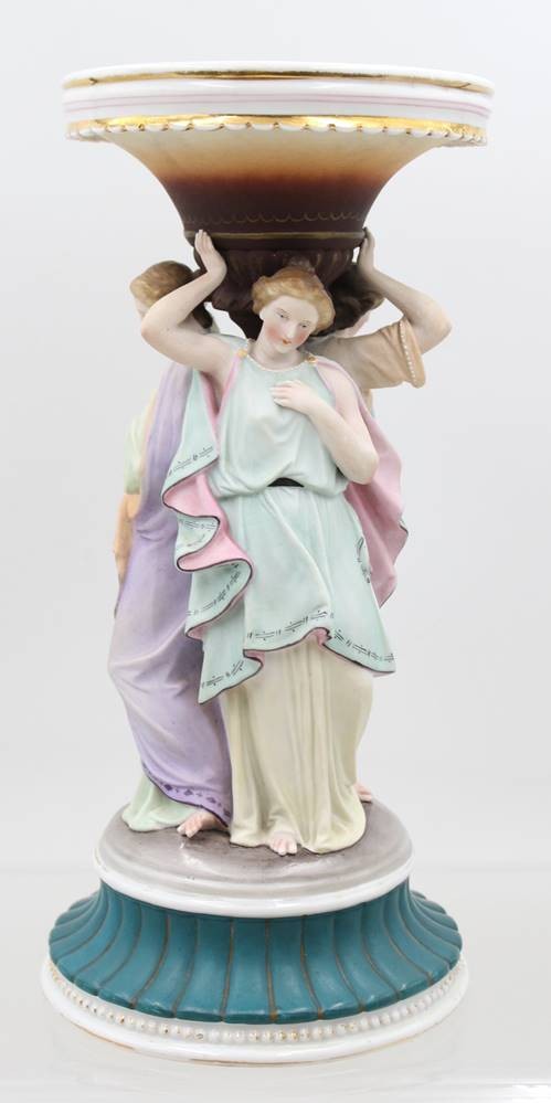 figürlicher Tafelaufsatz, Drei Grazien, farbig staffiert, ungedeutete Schwertermarke?, ca. H-30cm D-13,5cm [1]
