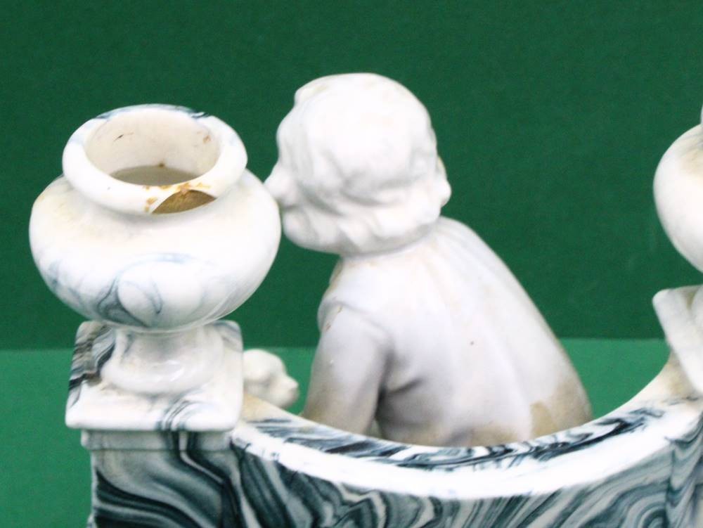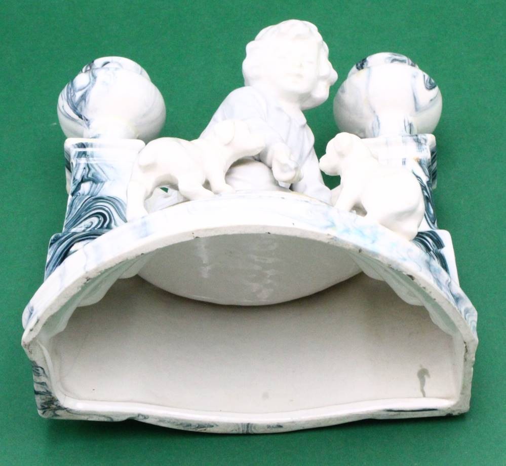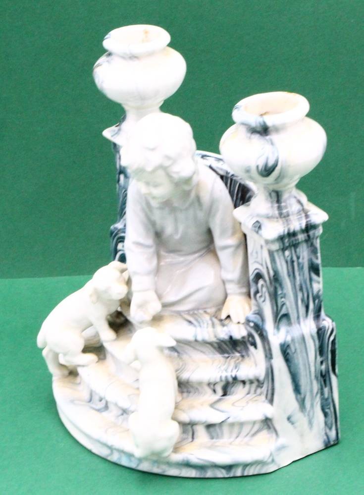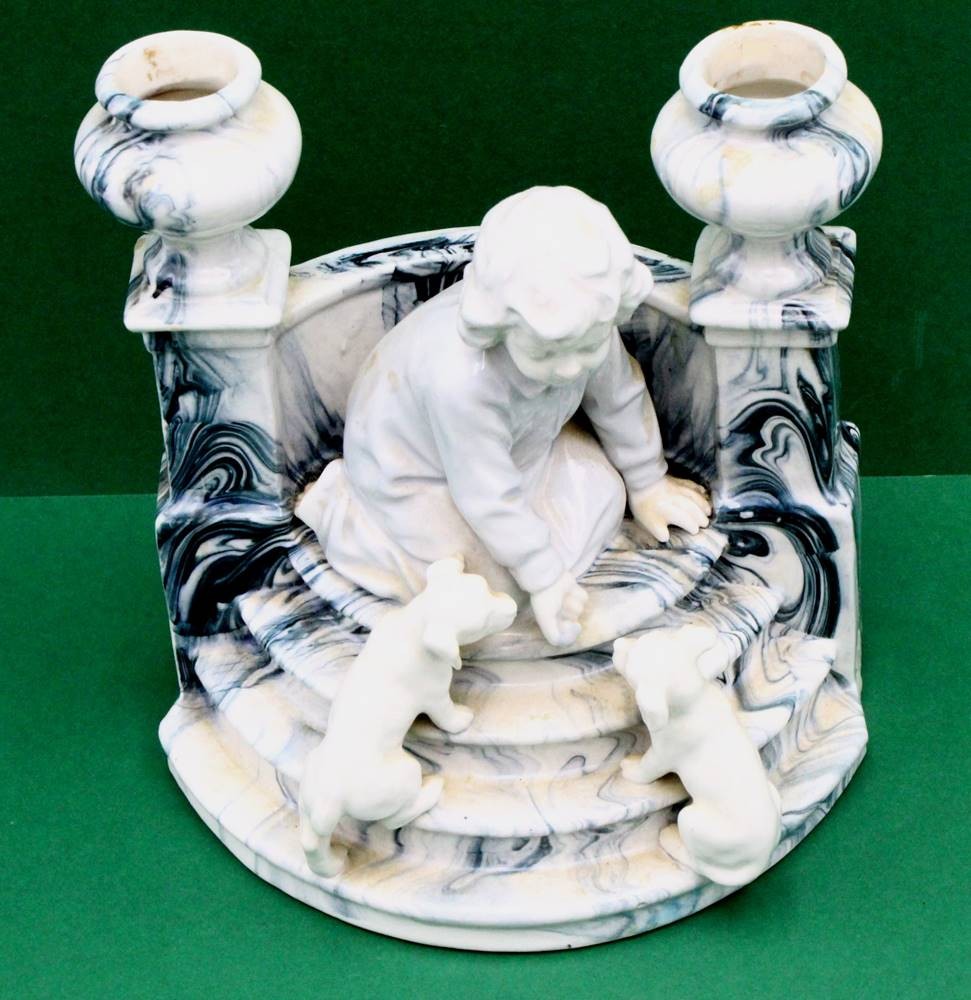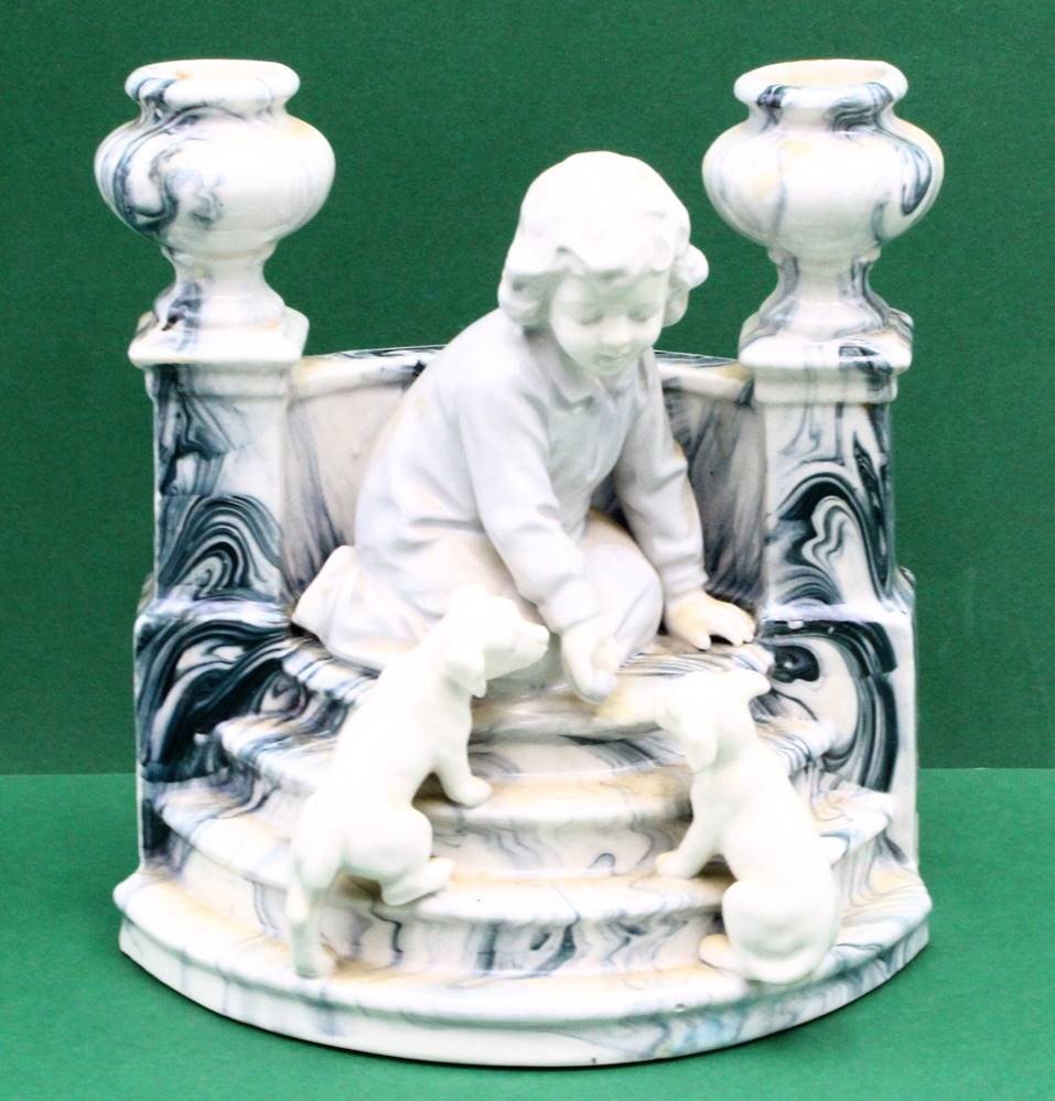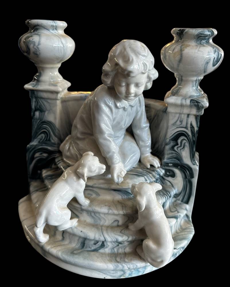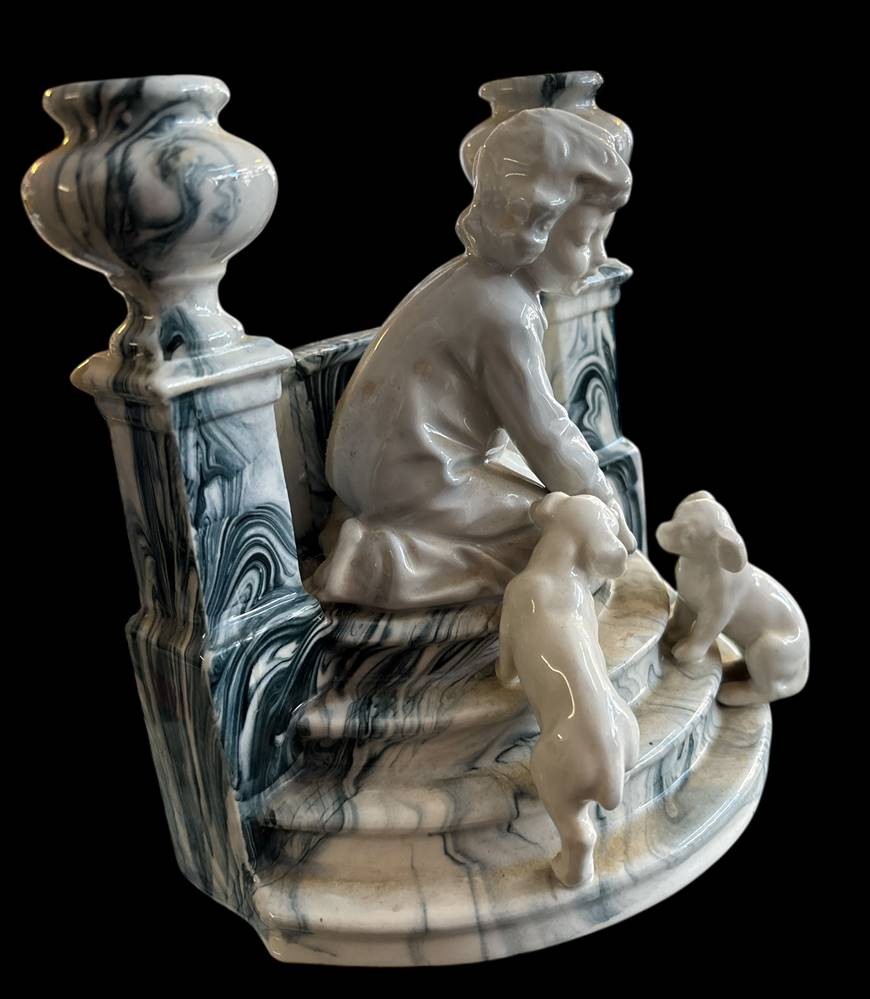Figurengruppe, Junge mit Hundewelpen, auf Treppe mit beidseitig Kerzenhalter?1x Rand mit Chip, 15x15 cm [1]
