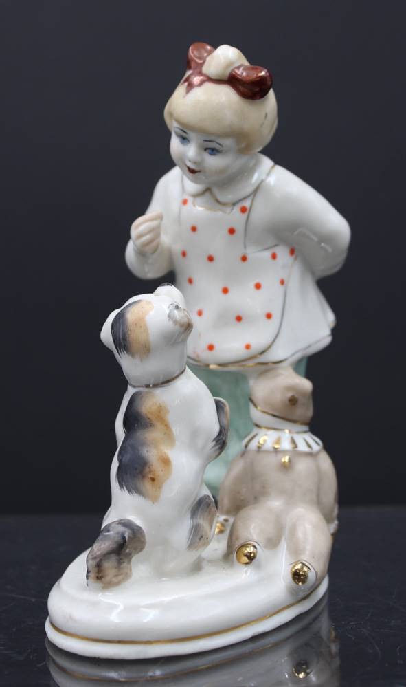 Figurengruppe, Mädchen mit Hund, gemarkt, Ukraine, älter, ca. H-15cm B-10,5cm