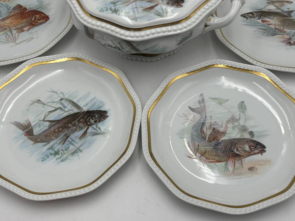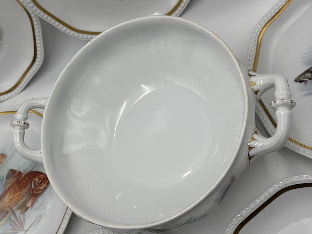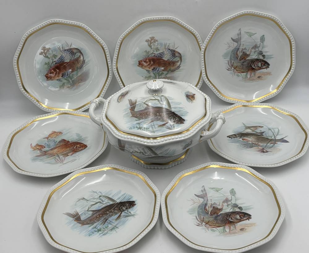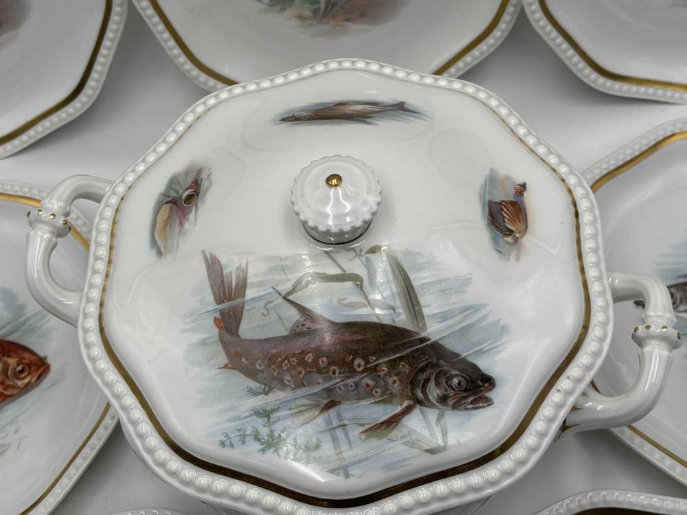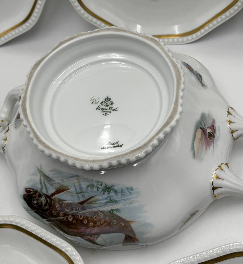 Fisch Terrine und 7 Fischteller "Rosenthal" Entw. Phillip Rosenthal, Form Maria weiss mit Fischdekor, H-17 cm, D-22 cm, Teller D-22 cm, guter Zustand [1]
