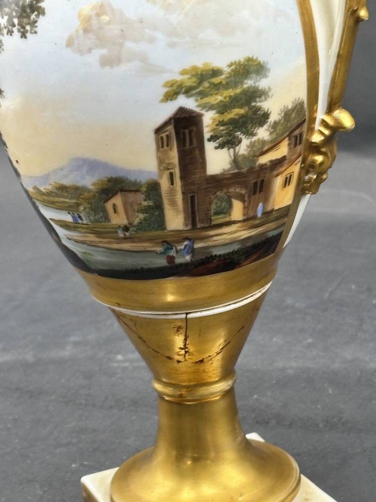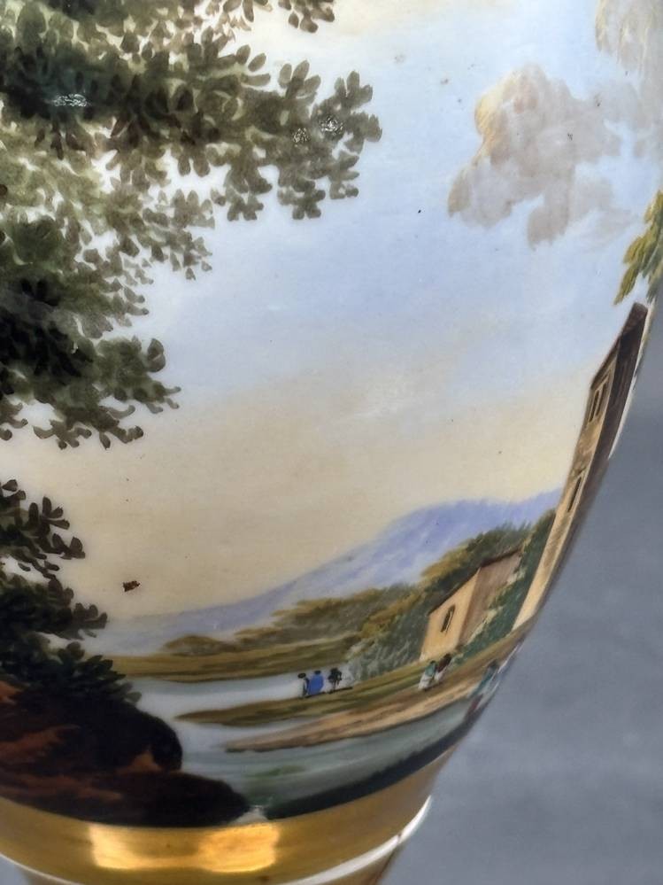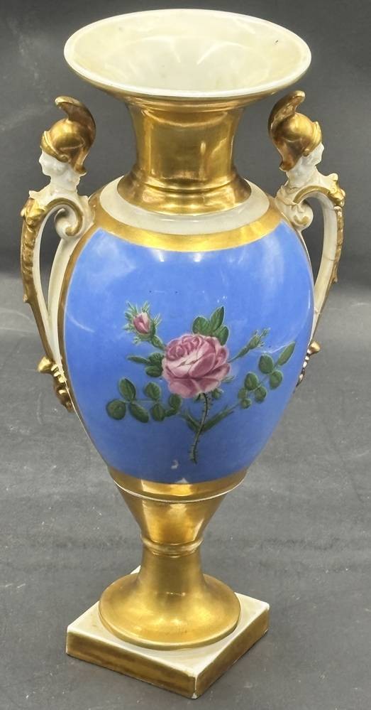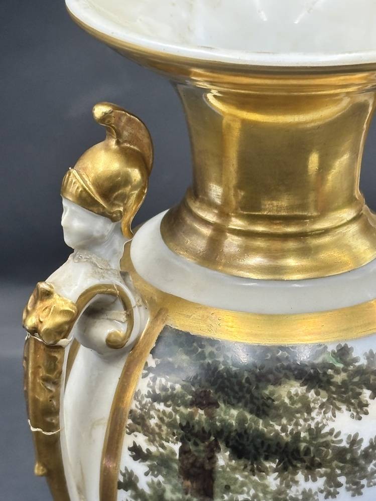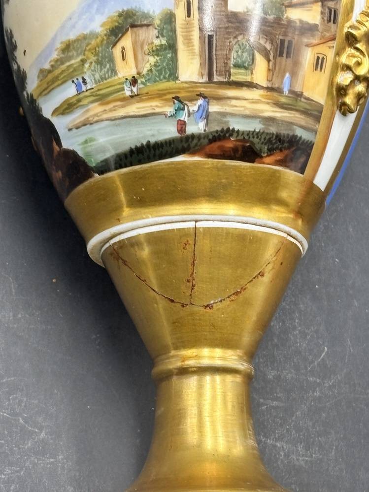 französische Empire Vase mit Landschaftsmalerei und Blumen auf blauen Fond, mehrfach geklebt, H-28 cm [1]