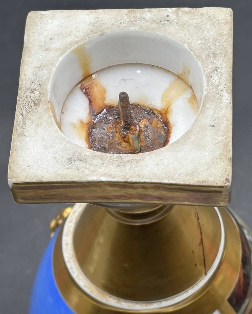 französische Empire Vase mit Landschaftsmalerei und Blumen auf blauen Fond, mehrfach geklebt, H-28 cm