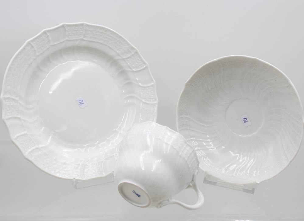 Gedeck, Meissen, Schwertermarke, Weißporzellan, jedes Teil mit Schleifstrichen, ca. H- 6,3cm [1]