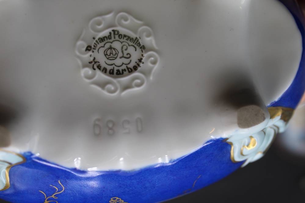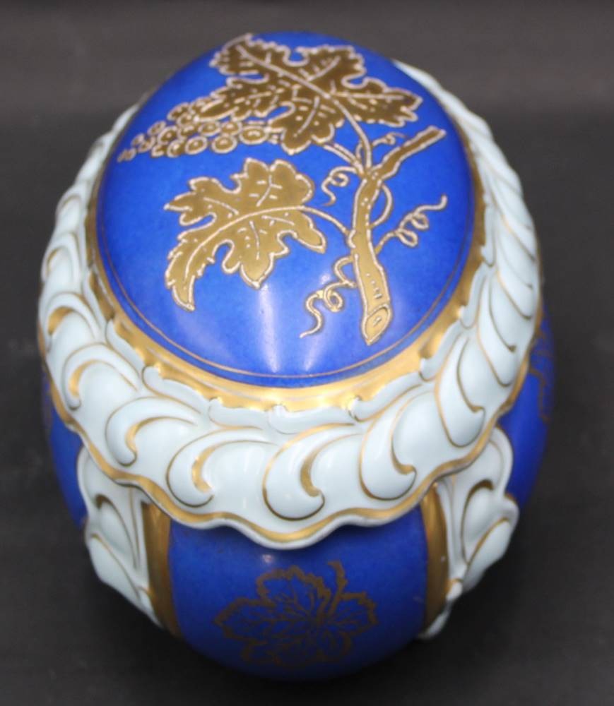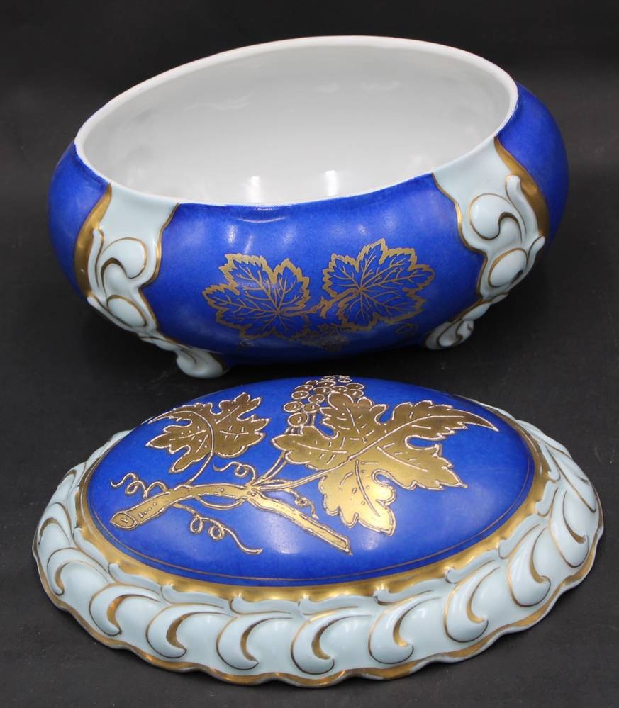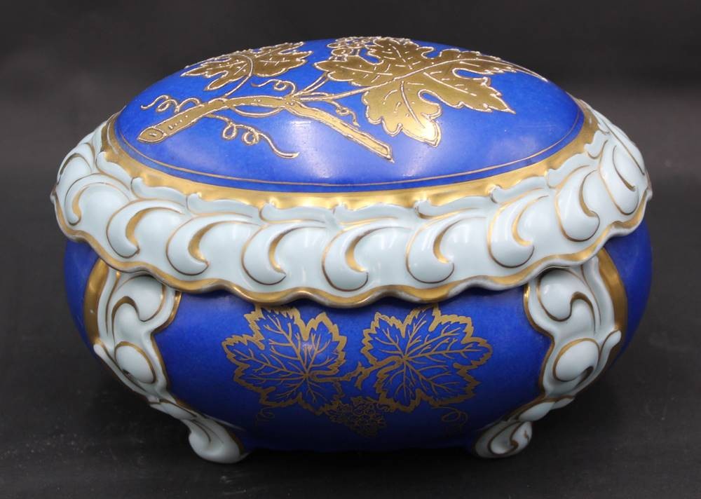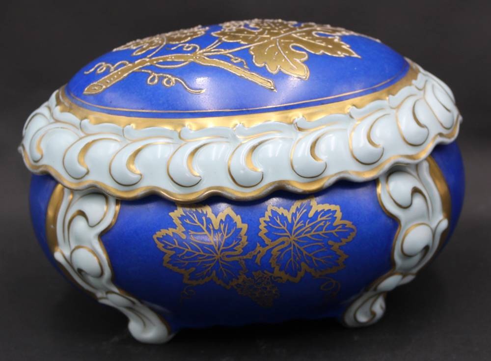 gr. Art Deco Bonbonniere Roland Porzellan Handarbeit, Goldstaffage auf blauen Fond, H-13 cm, L-20 cm [1]