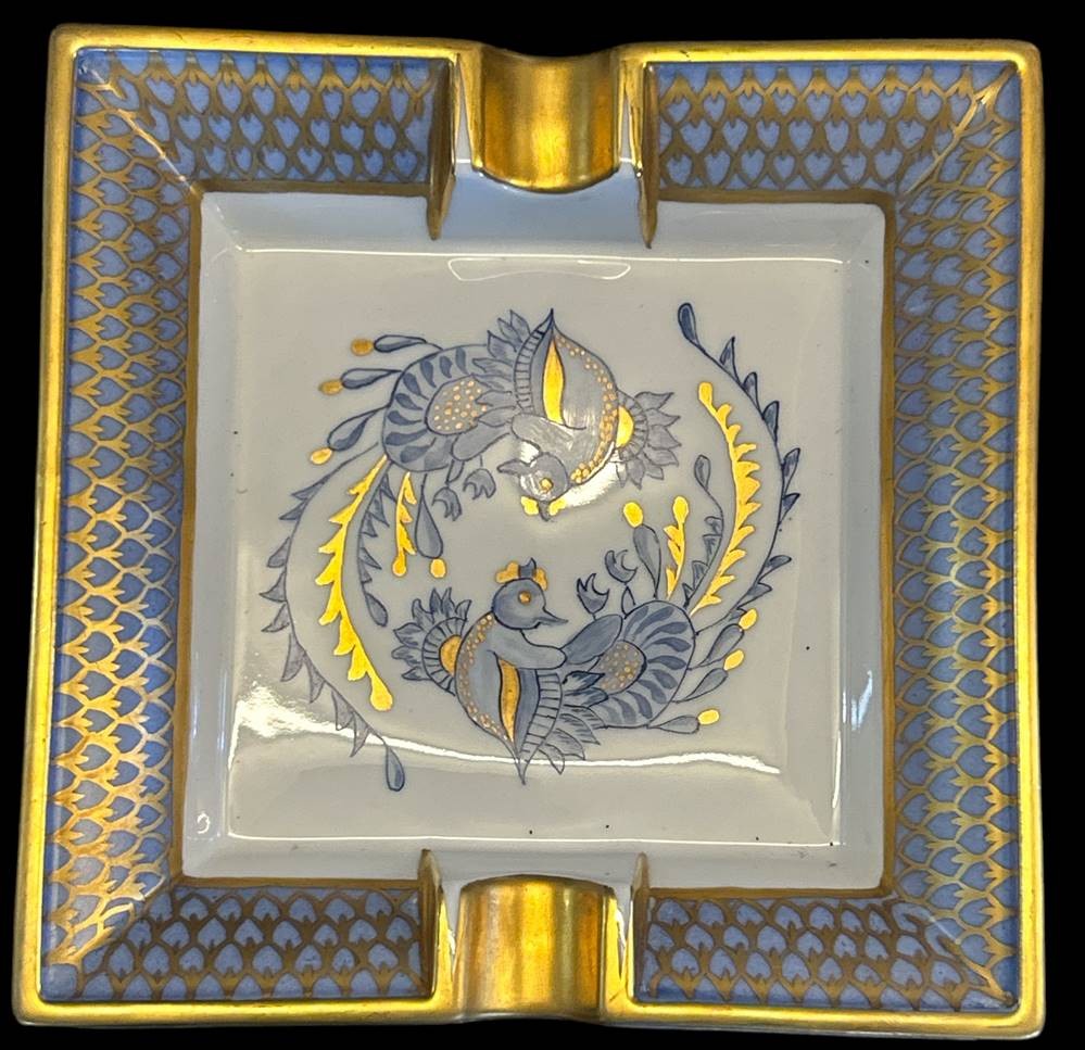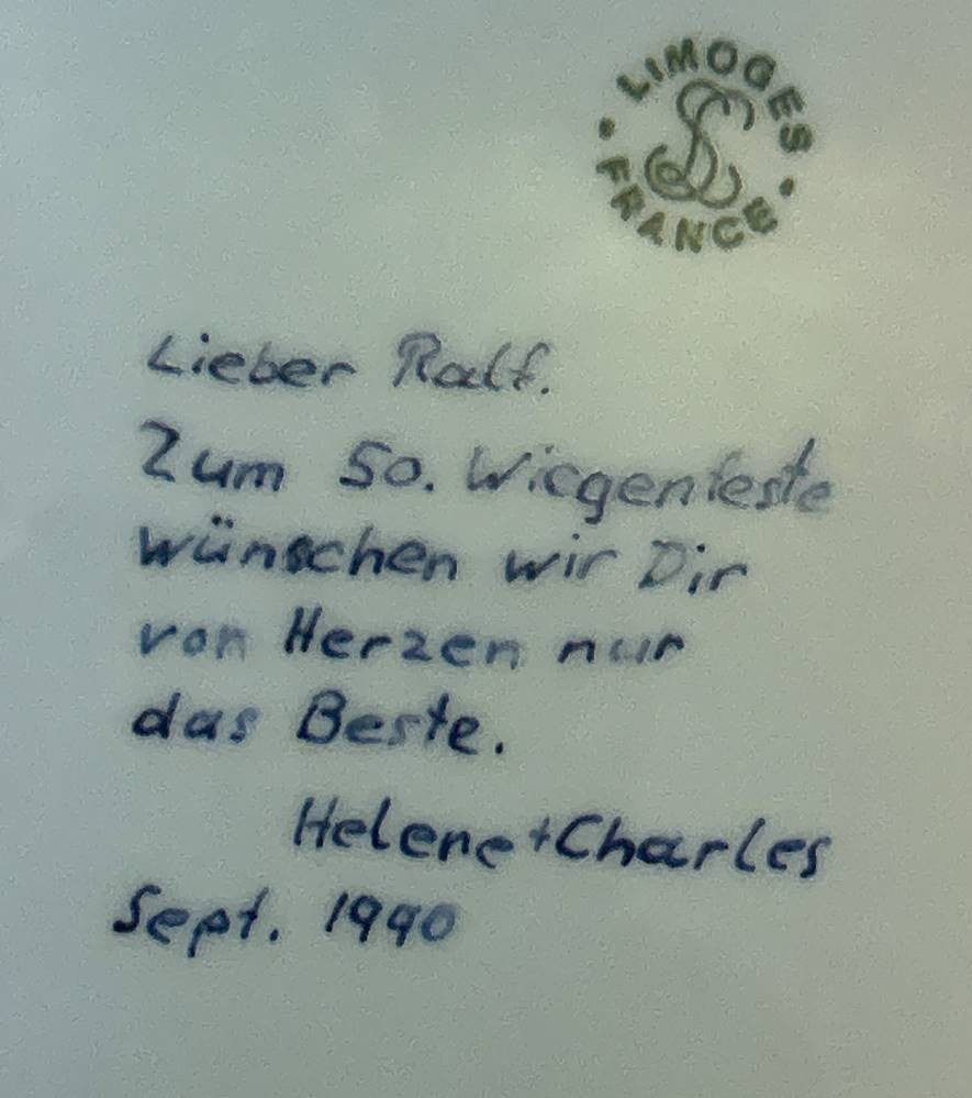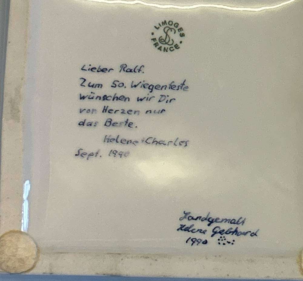 gr. Ascher, "Limoges-France" handgemalt von Helene Gebhardt, 1990, verso mit Widmung, 18x18 cm [1]