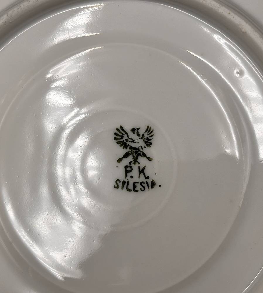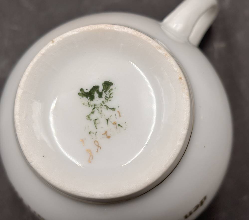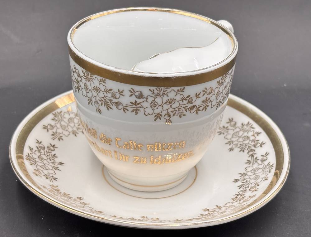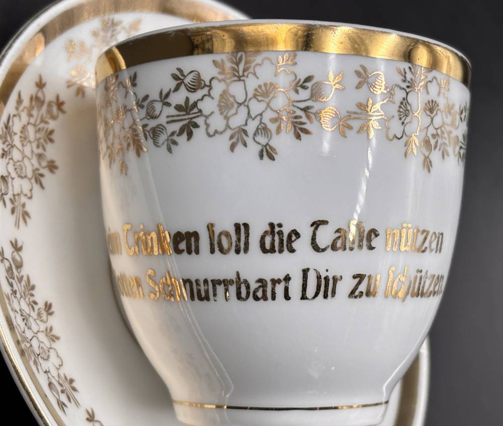gr. Barttasse mit Spruch, U.T., Goldstaffage , P.K. Silesia,"Beim Trinken soll die Tasse nützen, den flotten Schnurbart dir zu schützen" H-8,5 cm, guter Zustand [1]
