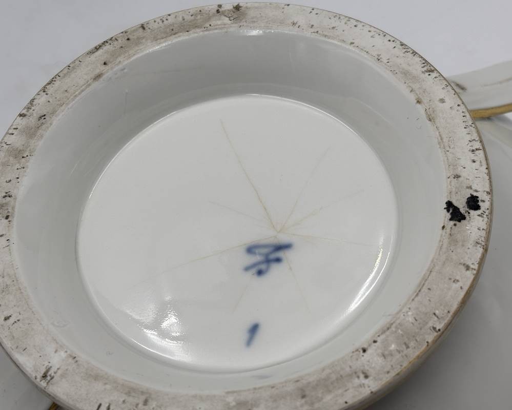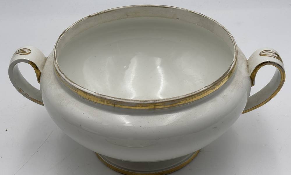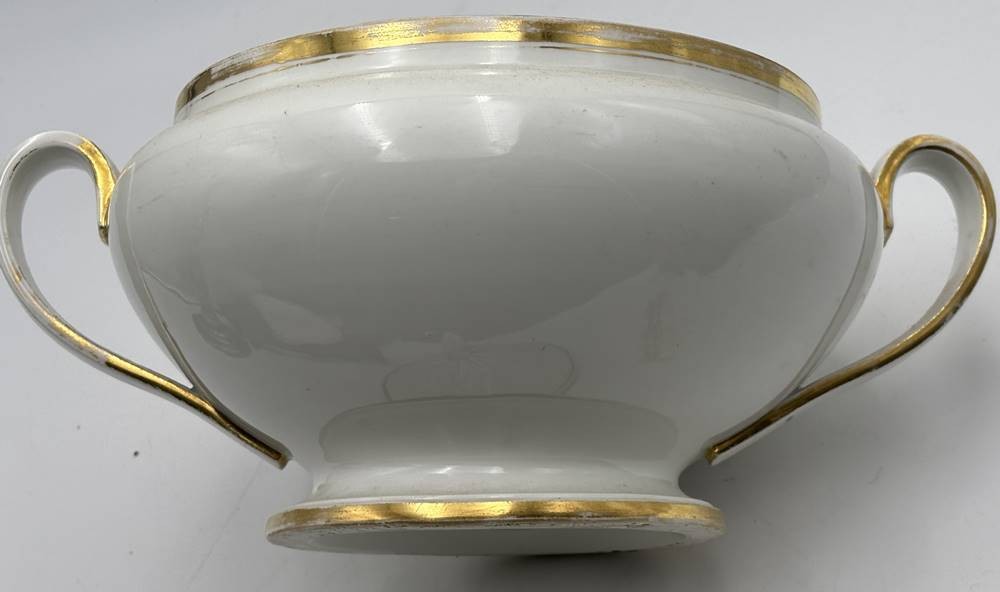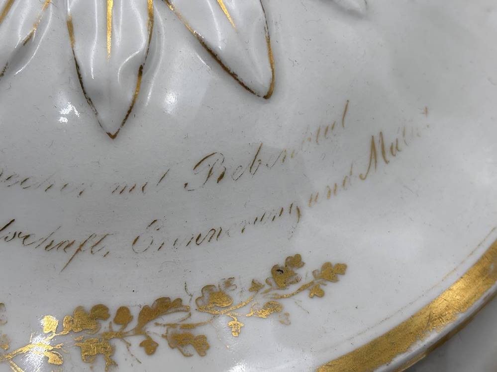 gr. Biedermeier-Terrine"Fürstenberg" um 1860 mit Spruch, Goldstaffage tw. berieben, H-21 cm, B-30 cm, Altersspuren, Boden mit Craquelee [1]