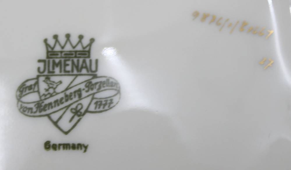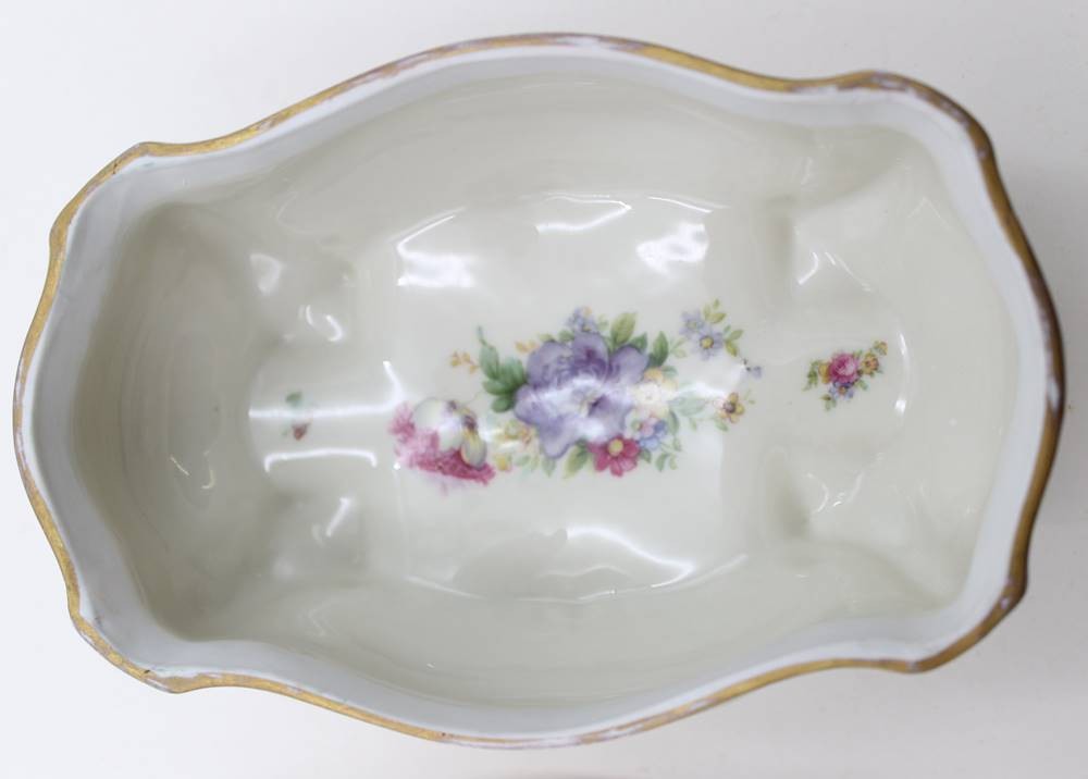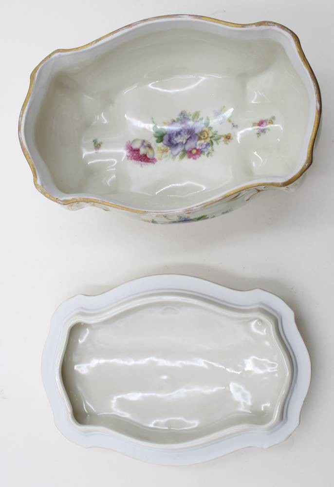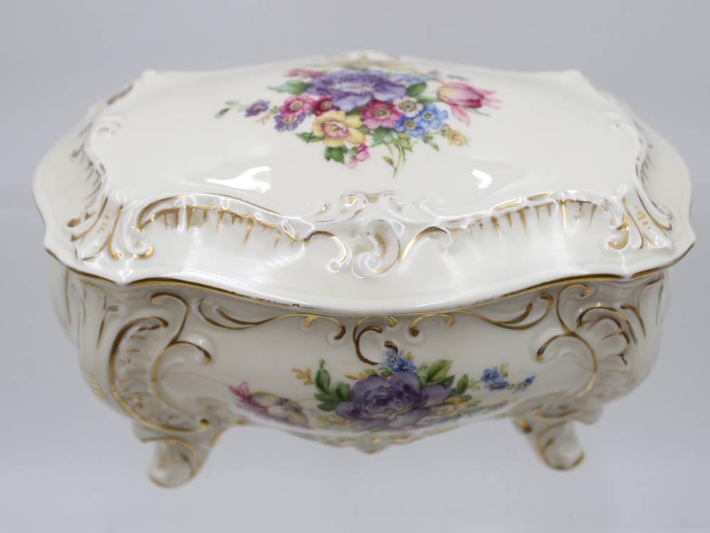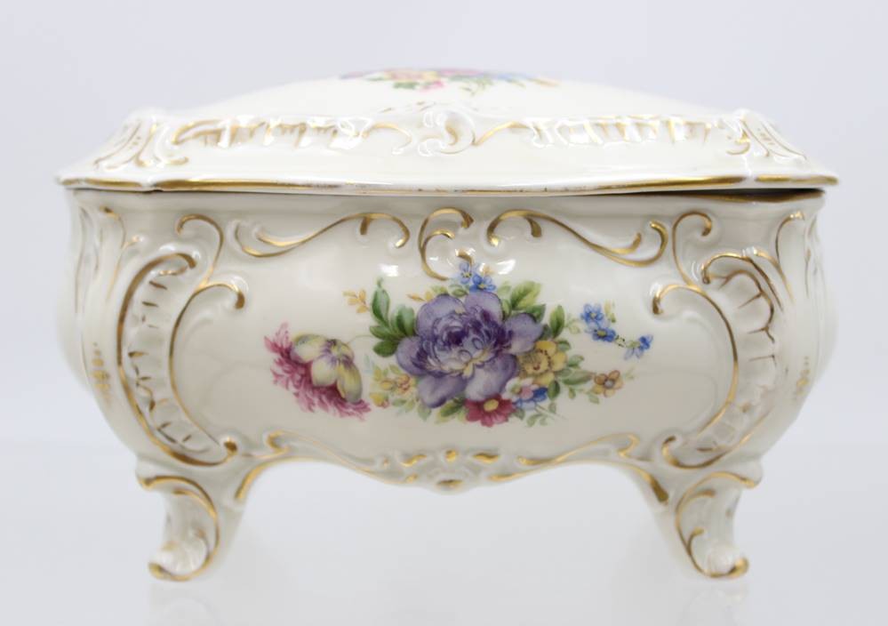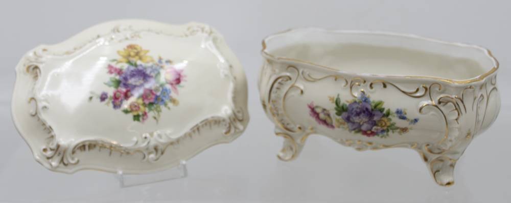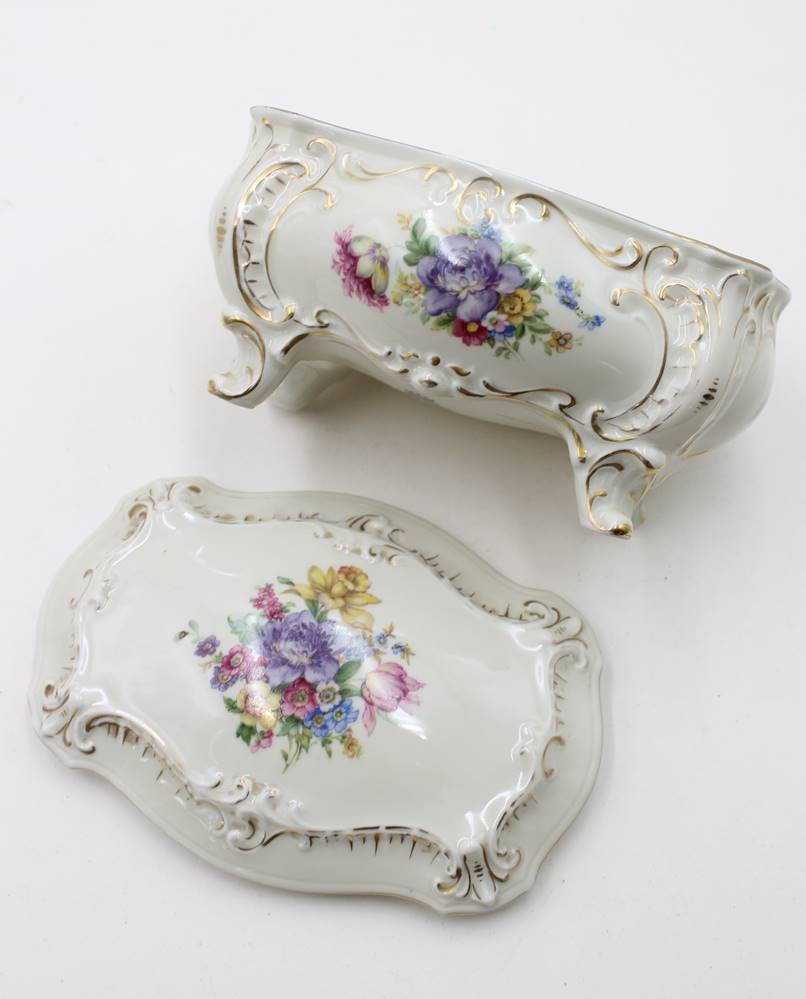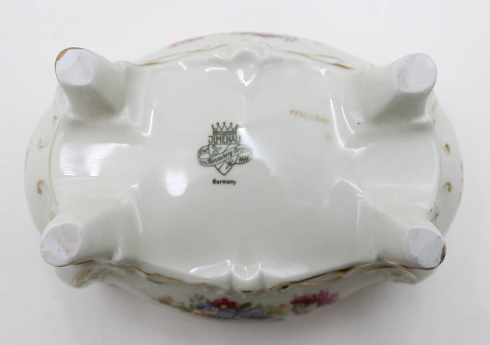 gr. Deckeldose auf Füssen, Illmenau, Graf von Henneberg, florales Dekor, ca. H-10cm B-18cm T-12cm [1]