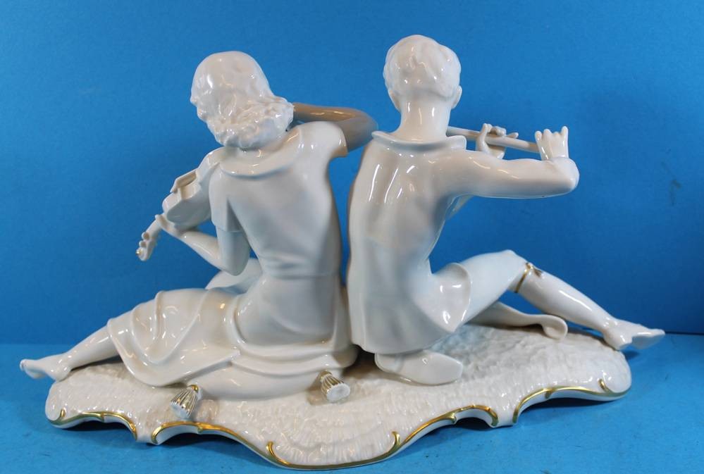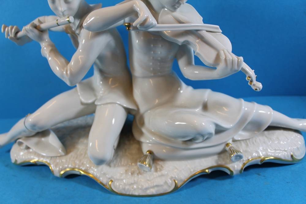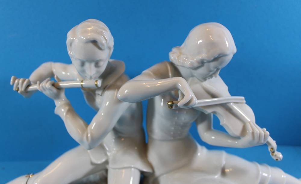 gr. Porzellanfigur Hutschenreuther "Sonate" Entwurf Carl Werner 1935, grüne Stempelmarke mit Zusatz Germany Kunstabteilung 1955-1968, naturalistische Ausformung mit dezenter Goldstaffage, auf oblongem, vierpassig geschweiftem Sockel sitzendes Kinderpaar, Flöte bzw. Geige spielend, guter Zustand, L 41cm.H-20 cm
