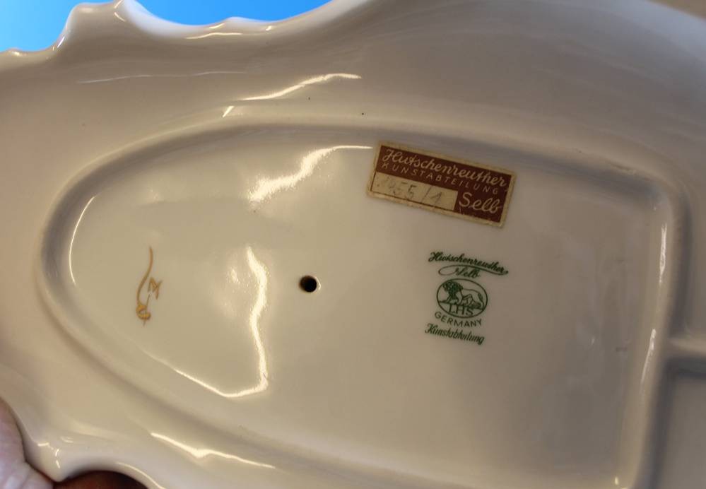 gr. Porzellanfigur Hutschenreuther "Sonate" Entwurf Carl Werner 1935, grüne Stempelmarke mit Zusatz Germany Kunstabteilung 1955-1968, naturalistische Ausformung mit dezenter Goldstaffage, auf oblongem, vierpassig geschweiftem Sockel sitzendes Kinderpaar, Flöte bzw. Geige spielend, guter Zustand, L 41cm.H-20 cm [1]