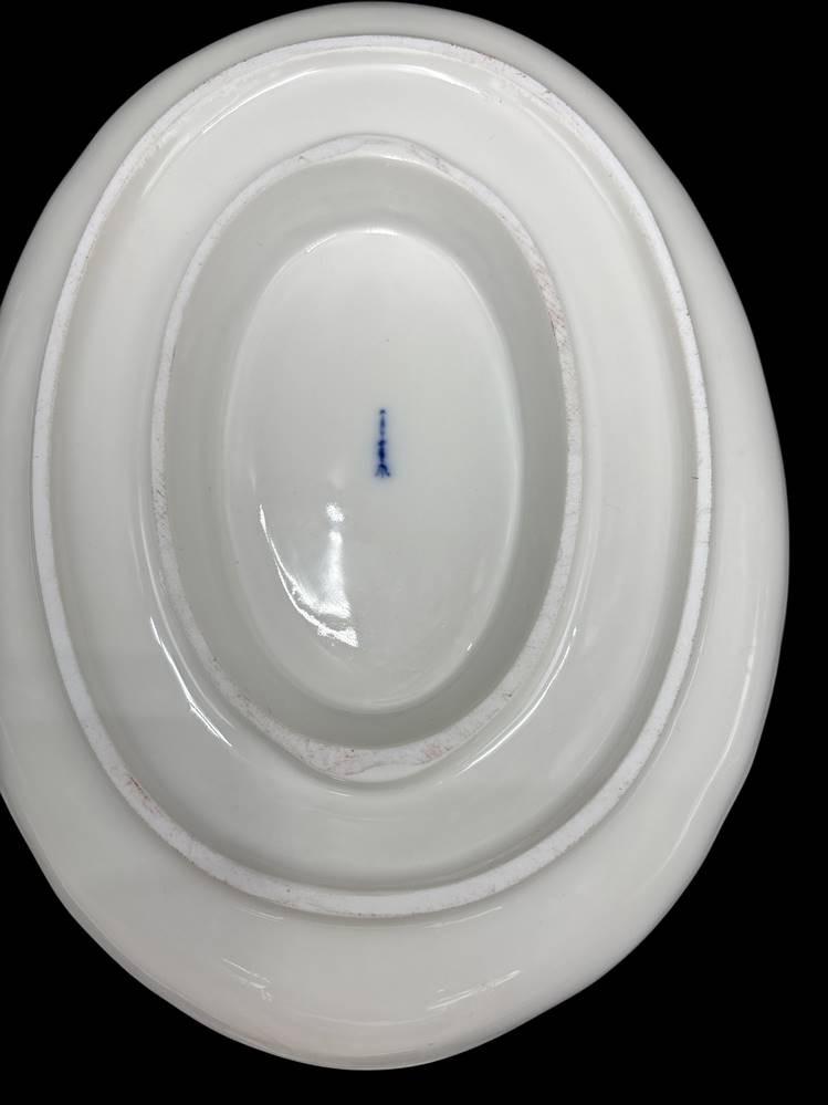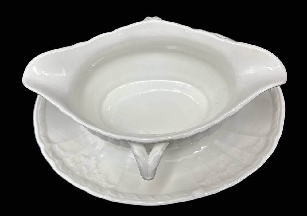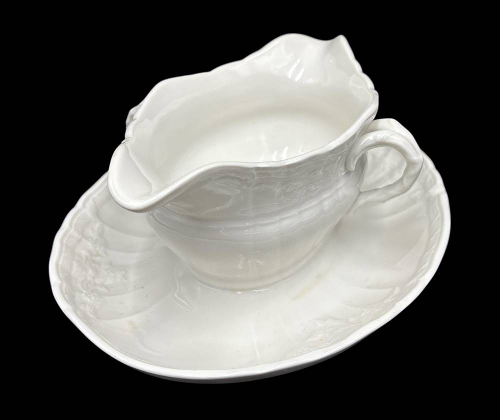 gr. Sauciere KPM Berlin, weiss mit Reliefdekor, Decor Rocaille blaue Zeptermarke [1]