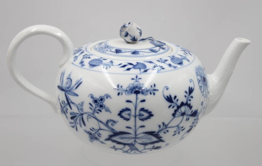 gr. Teekanne, Meissen, Zwiebelmuster, 4 Schleifstriche, Deckelblüte bestossen, H-14,5cm [1]