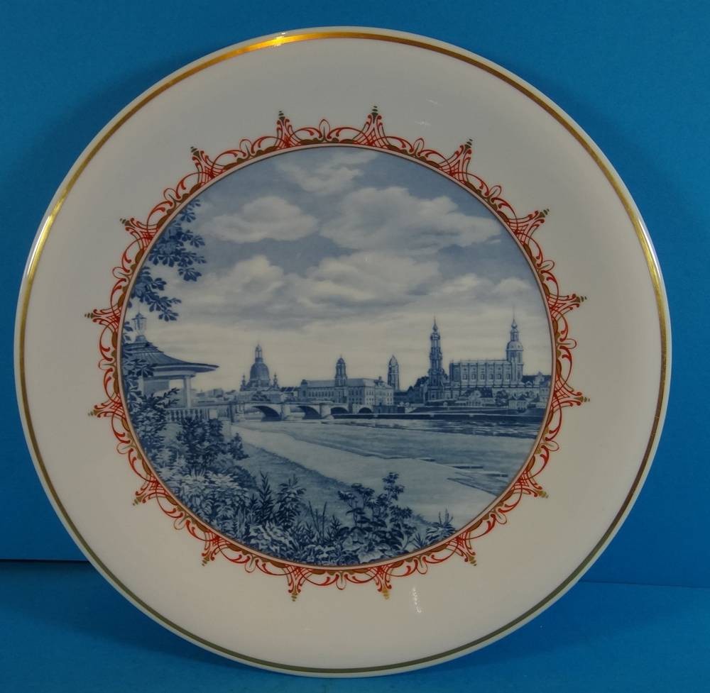 gr. Wandteller "Meissen" Aquatinta Ansicht von Dresden, Schwerter mehrfach durchschliffen, D-31 cm [1]