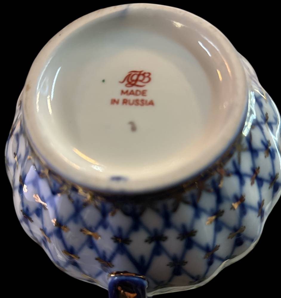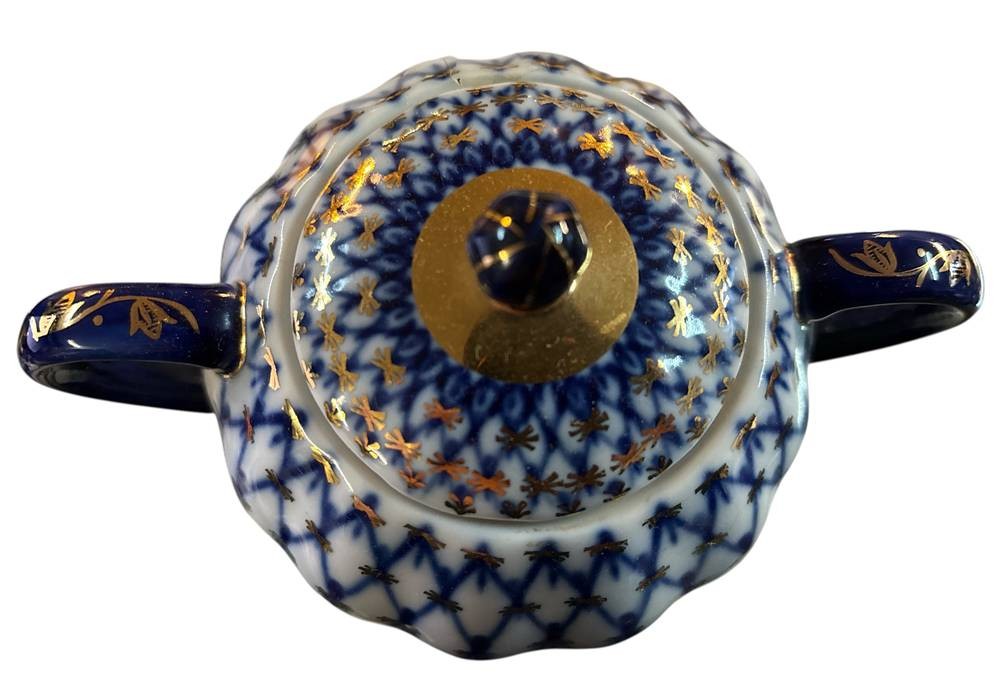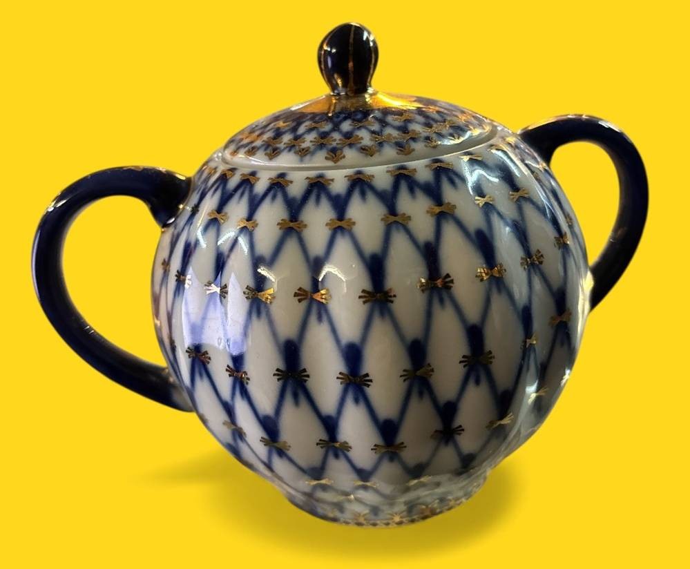 gr. Zuckertopf"Lomonossov", blaues Netzgitter mit Gold, H-11 cm, B-17 cm [1]
