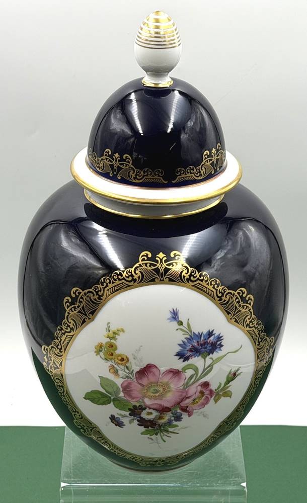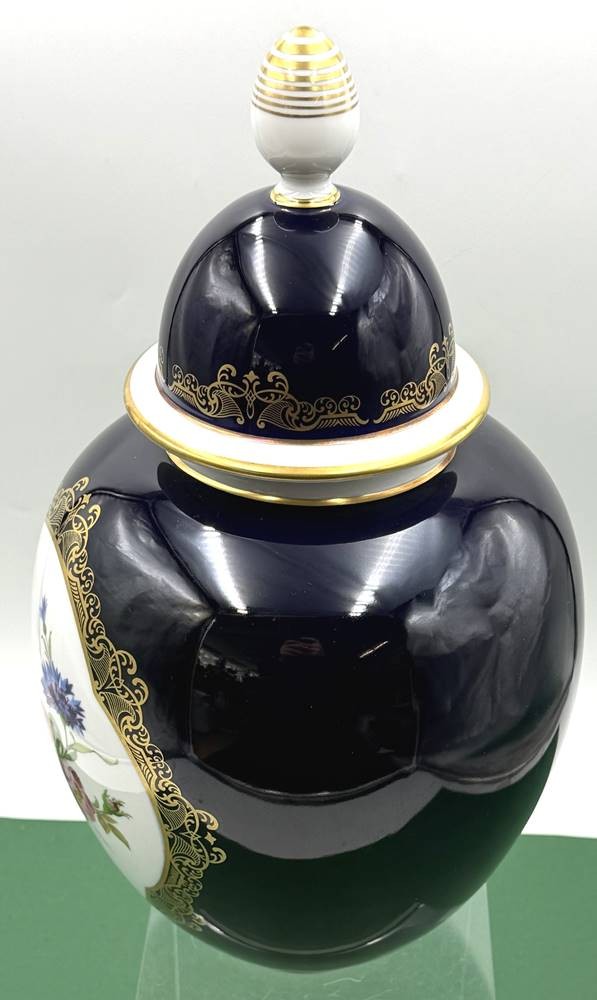 grosse Deckelvase "Weimar" Kobalt mit Gold und Blumen, H-38 cm [1]