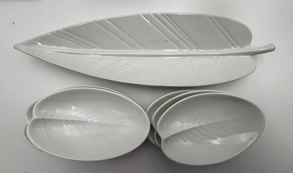 grosse und 6 kl. Blattschalen, grosse von Edelstein, 6 kleine von Rosenthal, weiss., L-30 und 11cm [1]