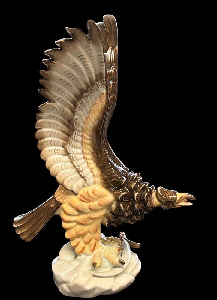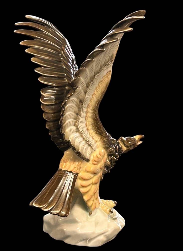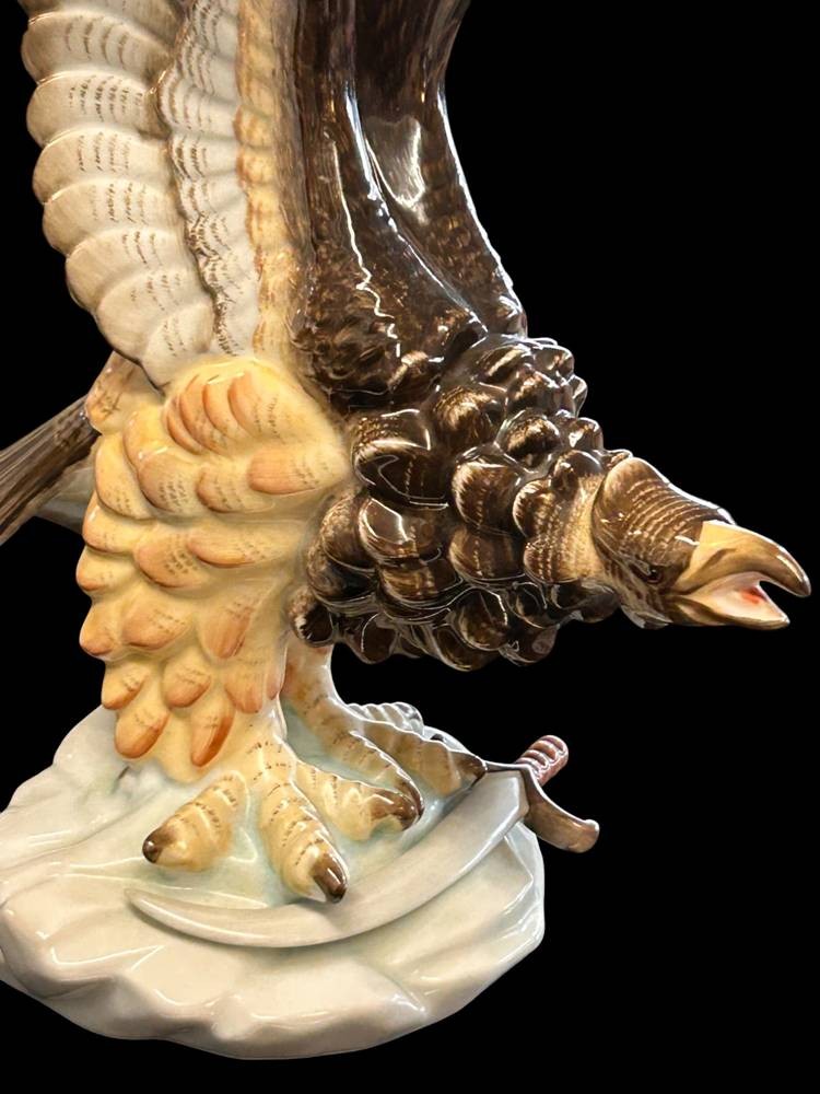 grosser Adler "Herend" bunt staffert, H-35 cm,eigentlich ein Turul (ungar. Fabelwesen) mit hochgezogenen Flügeln, zu seinen Klauen ein Krummsäbel liegend, felsartig gestalteter Sockel, polychrome Staffage, blaue Marke, H. ca. 35.
