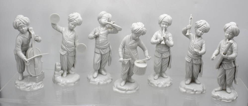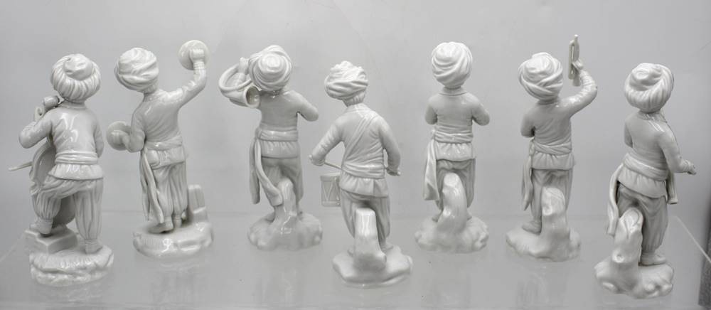Höchst, 7 Musiker der Serie Türkische Kapelle, Entwurf Johann Peter Melchior 1775-1779, Weißporzellan, alle in sehr gutem Zustand, je ca. H-18cm [1]